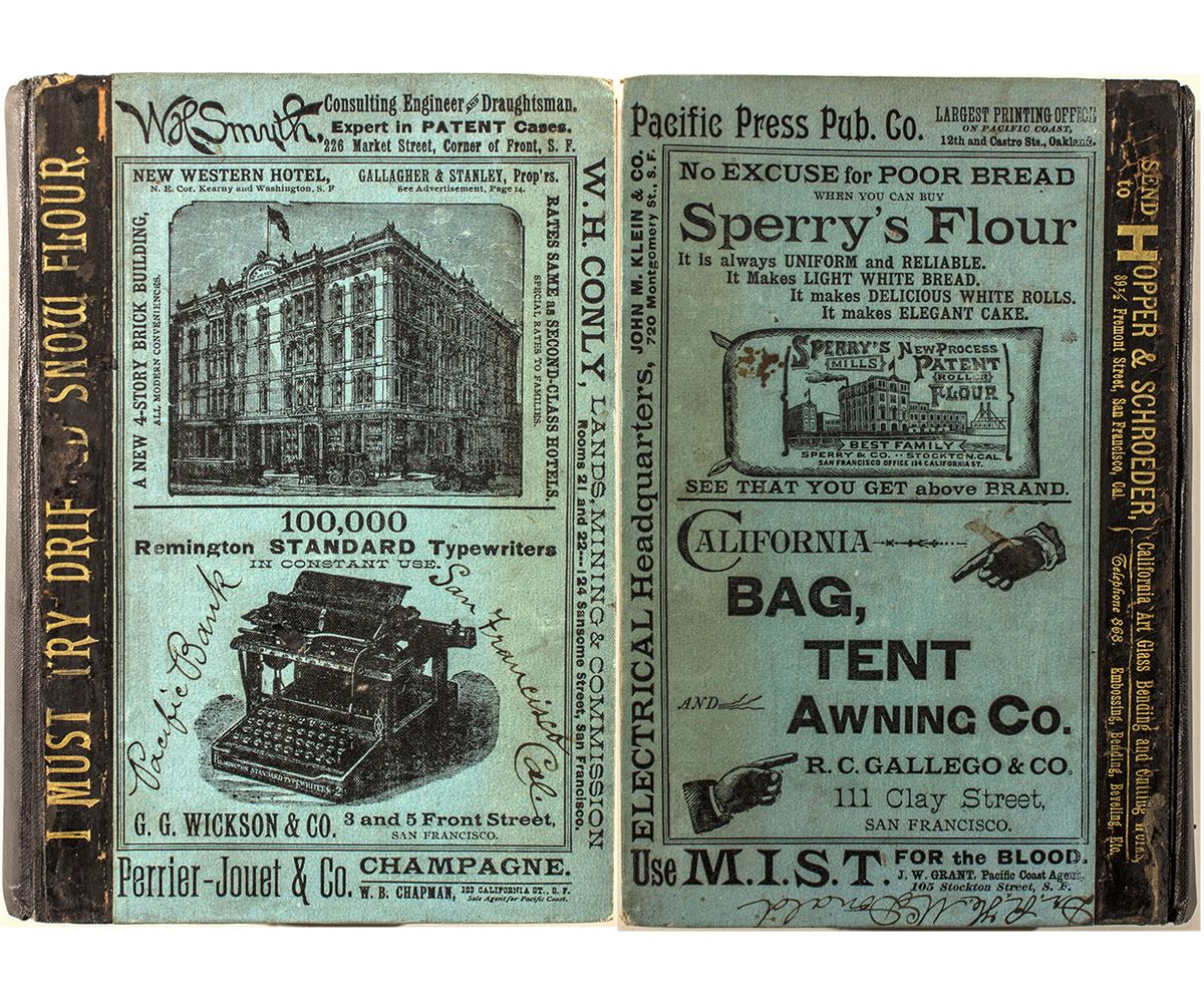 San Francisco Directory used by the Pacific Bank, San Francisco, California. Includes: Alameda, Berkeley, Oakland, San Francisco. Hard bound, with ad on blue covers. (9" x 6") 524 pp. Missing title page. New spine. Some pages are toned.