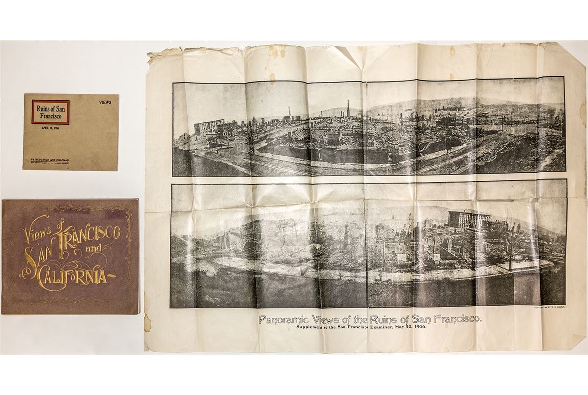 Views of San Francisco, a booklet of photos before the earthquake, printed in 1905. Another booklet, "Ruins of San Francisco", dated April 18. 1906. Both are in very good condition. Large sheet of panoramic views after the 1906 earthquake, a supplement to the San Francisco Examiner, May 20. 1906. Piece is folded, edges rough, fragile.