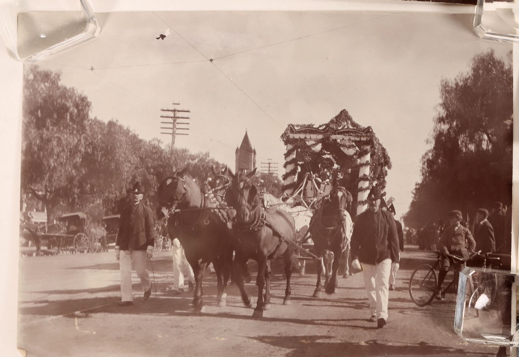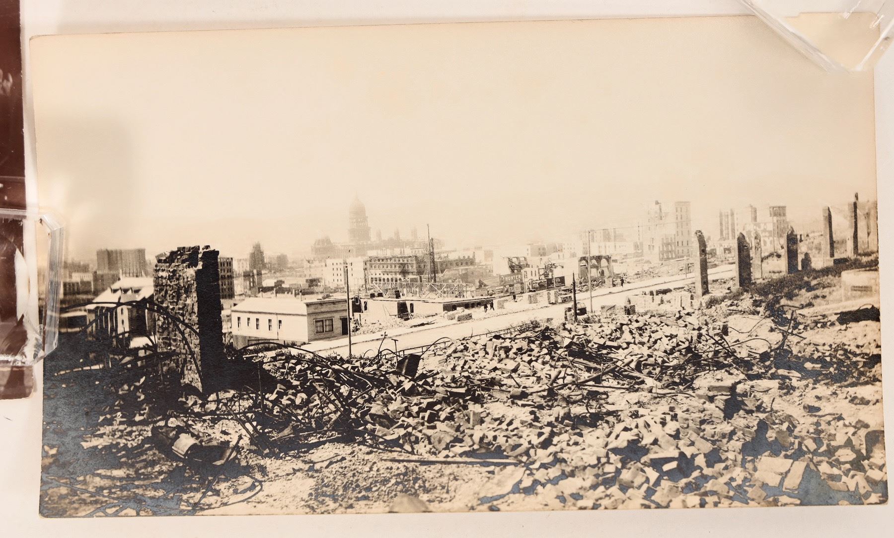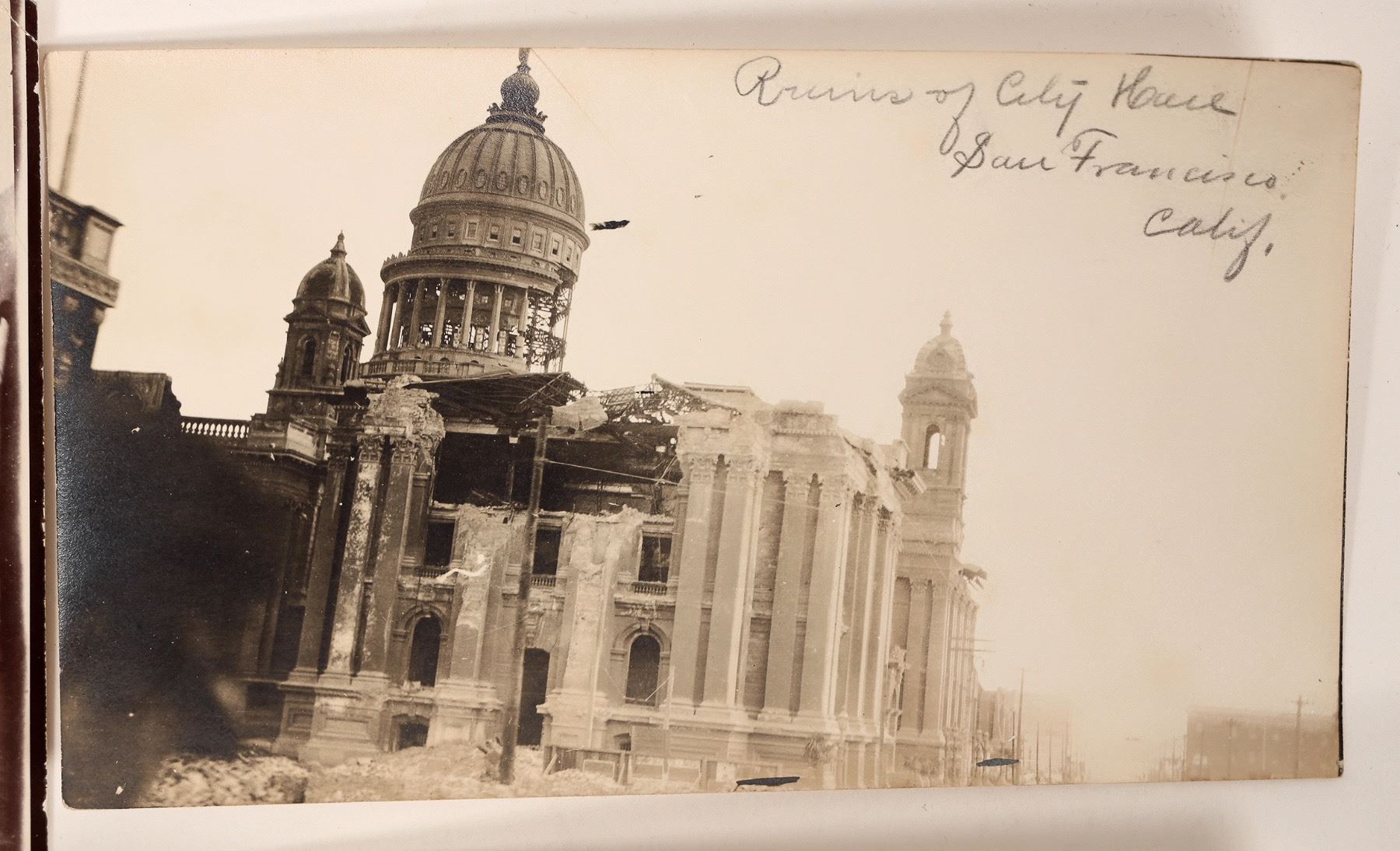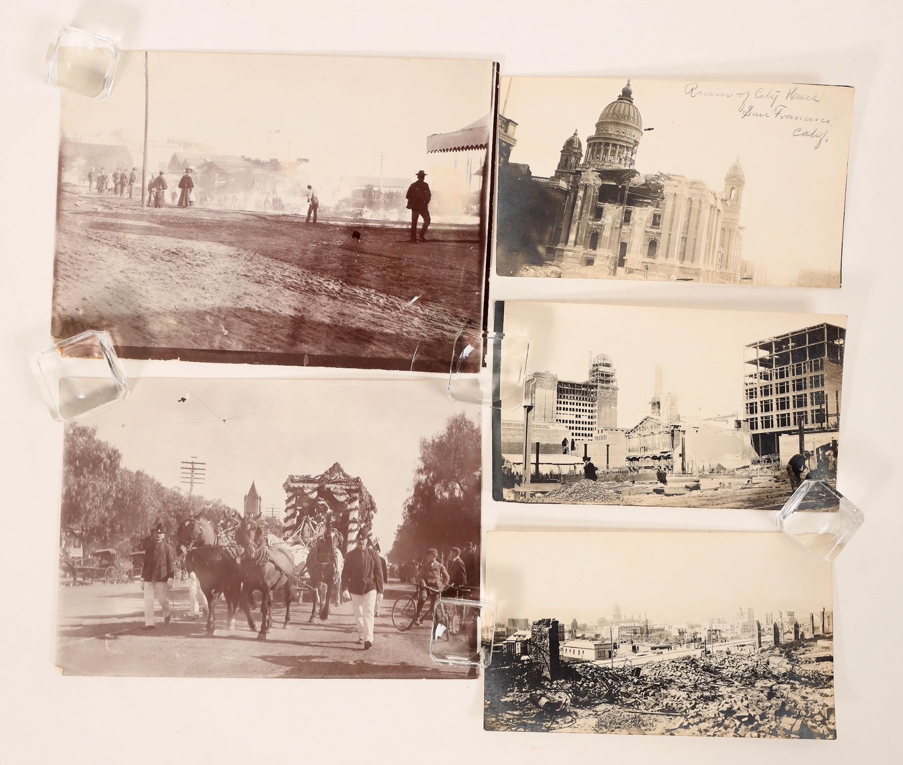 5 original San Francisco earthquake photos, these are NOT repros. 3x5.25"-ruins of city hall, ruins after 1 year x2. 5x7" glossy-funeral with horse drawn wagon? and ruins.[ San Francisco California