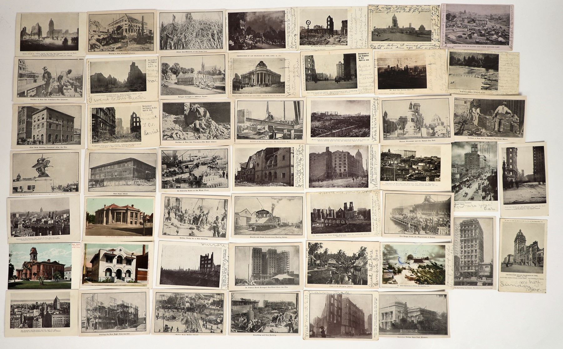 Lot of around 50 postcards detailing the damage and rebuilding from the 1906 San Francisco Earthquake. Some from the San Francisco Sunday Examiner; Edward H. Mitchell; M. Rieder; and Rieder-Cardinell Co. Please inspect.