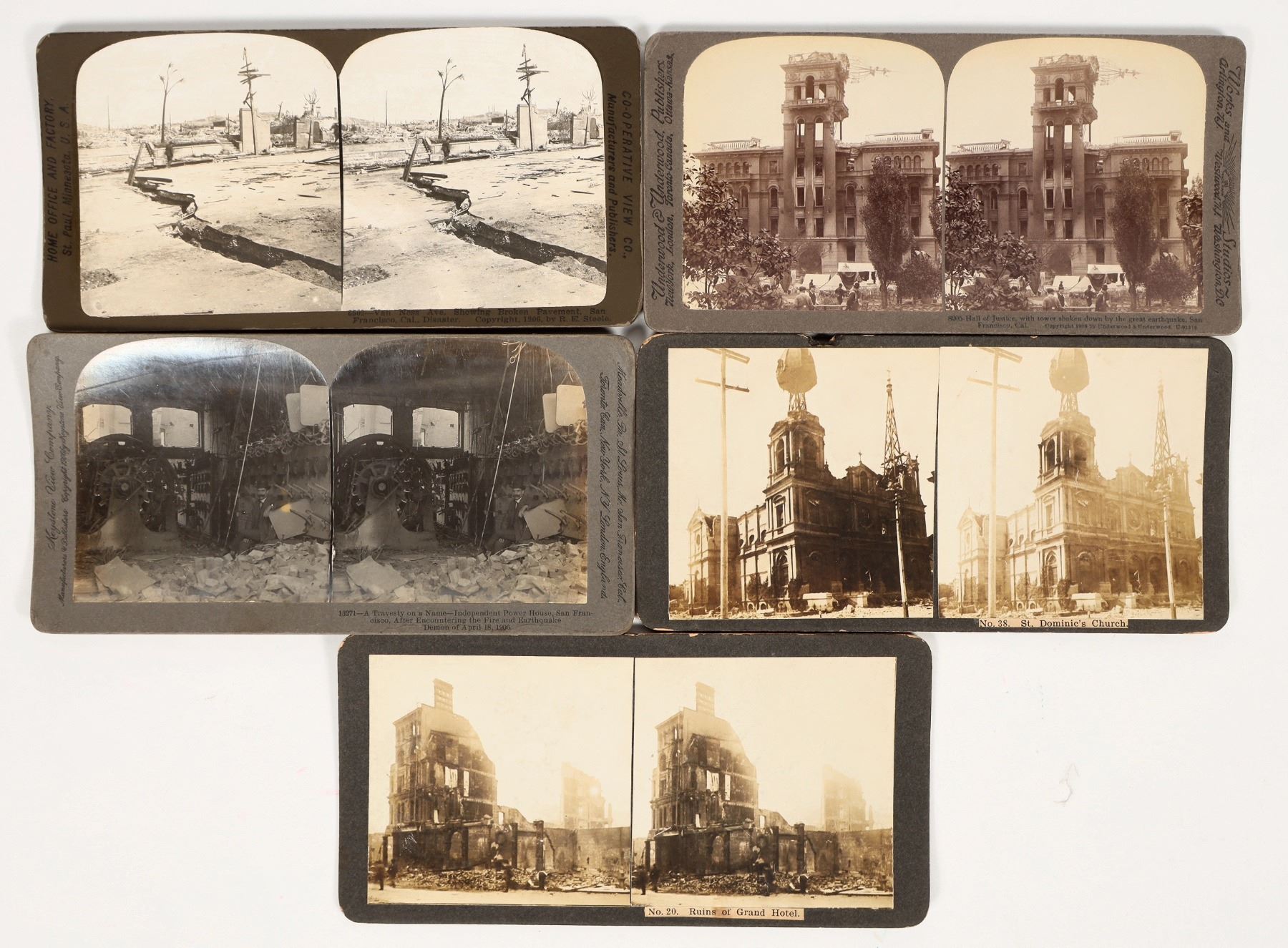 Lot of 5 different. Includes: Van Ness Ave.; Ruins of Grand Hotel; St. Dominic's Church; Hall of Justice; and Independent Power House. One Keystone, one Underwood & Underwood, one RE Steele, and two unidentified.