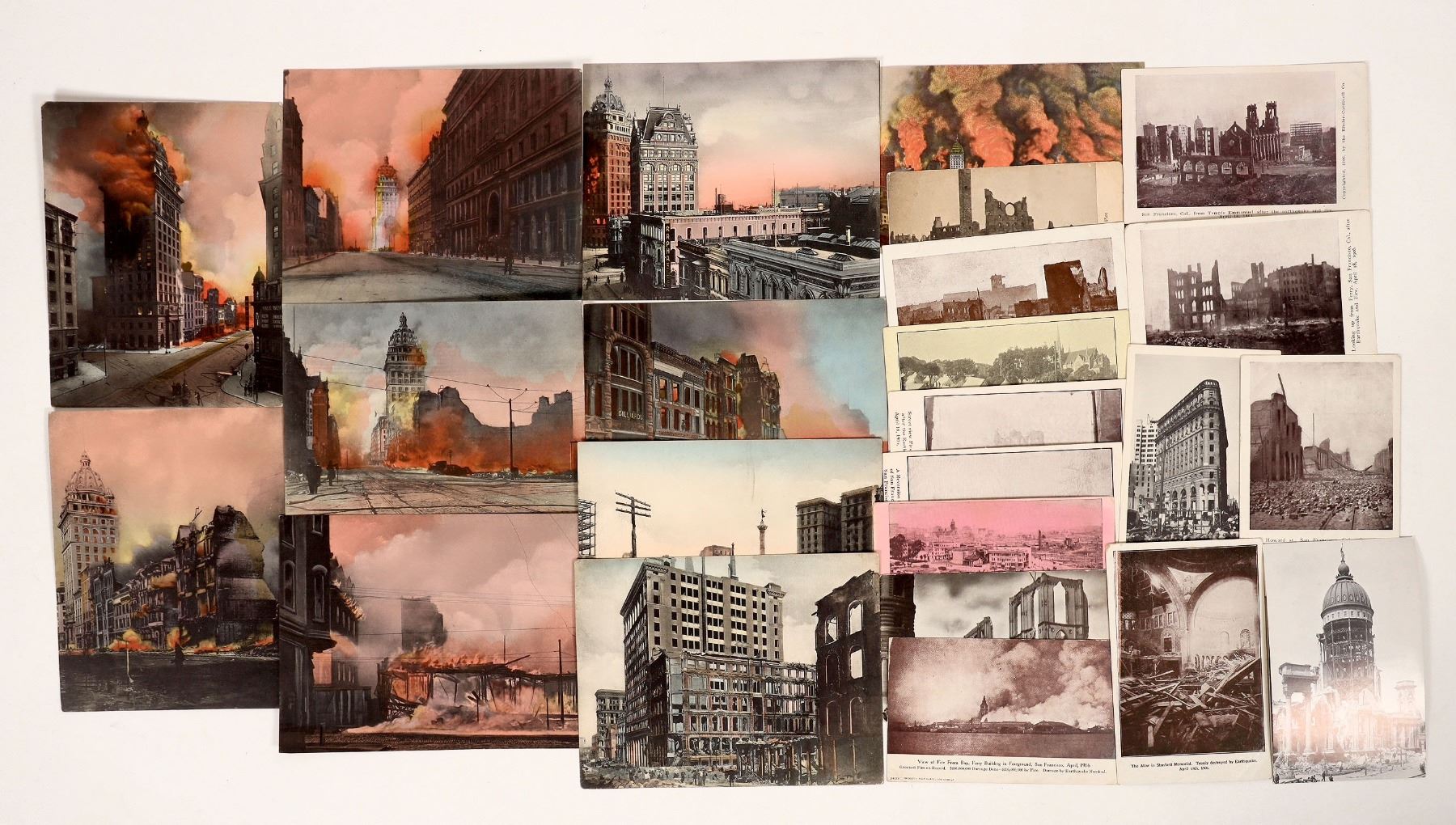 An amazing collection of postcards cataloging the destruction of the April,1906 San Francisco earthquake and resulting fire. One building collapsed in less than 30 seconds. 23 postcards in all. 7 are large format at 5.5 in. X 7 in. Some are colorized. Very good to excellent condition.