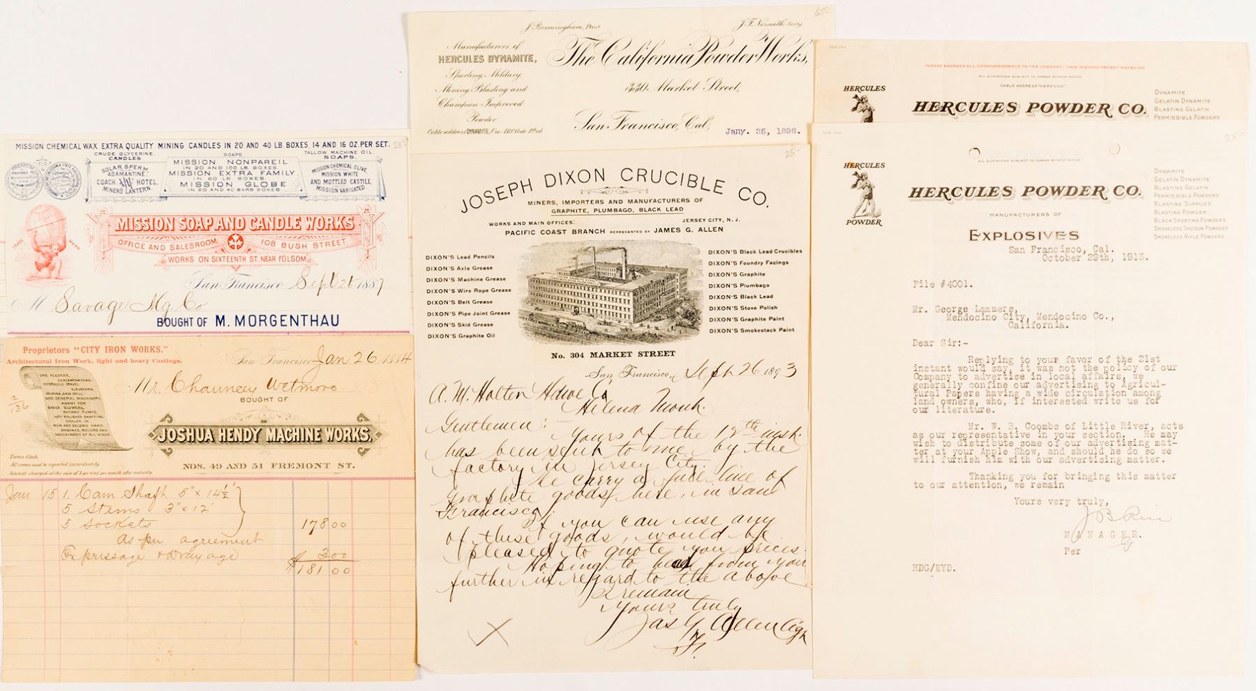 Lot of 6. 2 Hercules Powder Co. letterheads 1913 and 1915, California Powder works letterhead 1898, with small fold tear, Joseph Dixon Crucible Co 1893 letterhead with vignette, Mission Soap and Candle Works receipt 1887, Joshua Hendy Machine Works receipt 1884. Date: Location: California HWAC # 53273