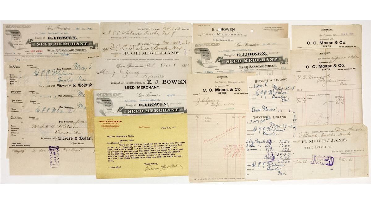 Receipts/statements from various farm and seed companies: E. J. Bowen, Seed Merchant; Sievers & Boland; Hugh McWilliams, The Florist; C. C. Morse & Co. Seeds; and more.
