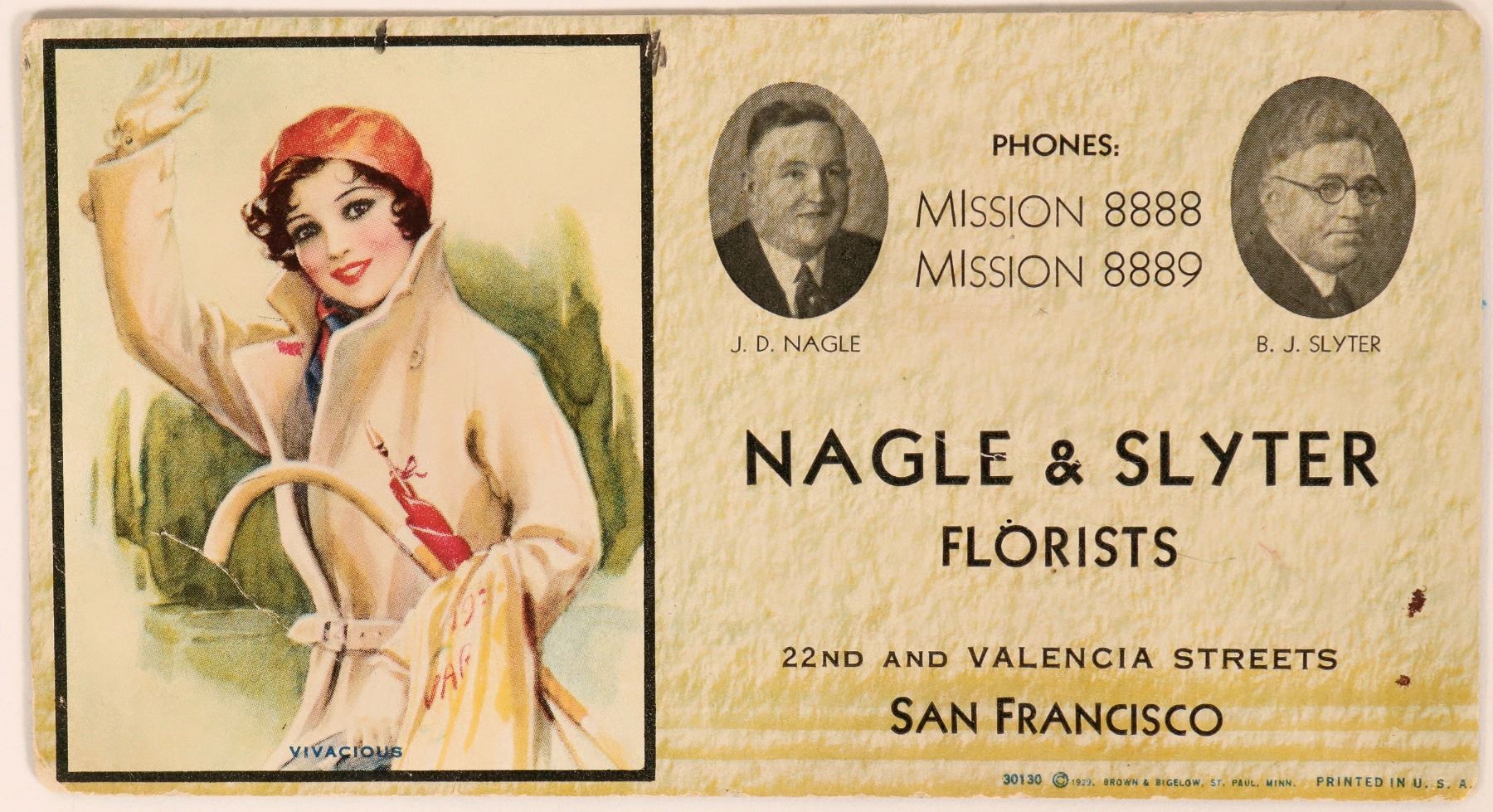 Art blotter with painting at the left titled, "Vivacious". Artist signature looks like VAF. Nagle & Slyter operated at 22nd and Valencia Streets, San Francisco. Brown & Bigelow, St. Paul, Minnesota copyright.