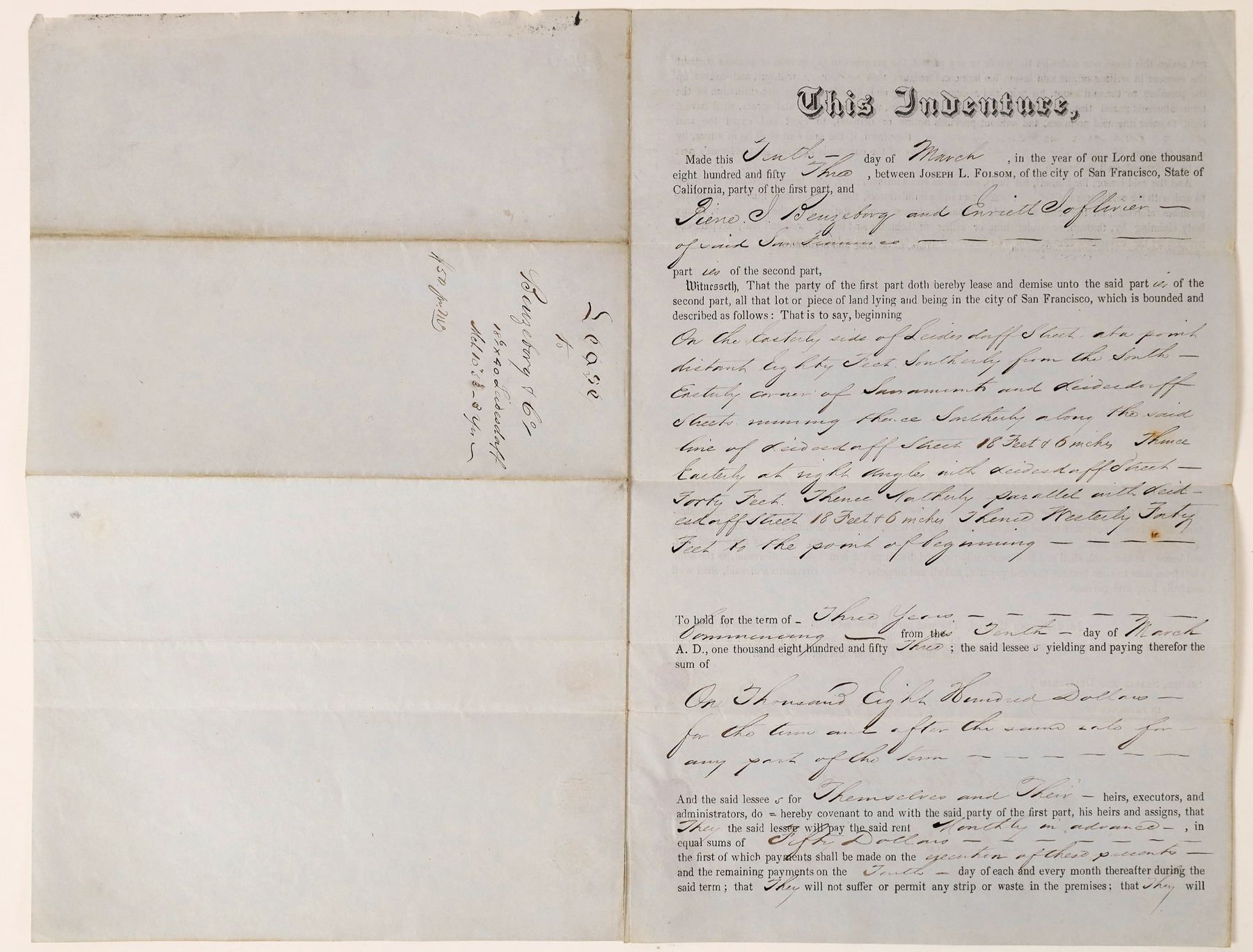 Indenture dated March 10th, 1853 between Piere Benzberg (?) and E. Jefferies (?) of San Francisco for property on Sacramento & Leidesdorff Streets. Handwriting is a little difficult to read. Signed on the reverse by Frederick Billings as attorney (and also signed by the two parties). Printed on light blue paper. Folds, some toning. 12.25 x 8" Frederick Billings (1823-1890) is the namesake of Billings, Montana. He moved to San Francisco in 1848 during the Gold Rush and became one of the city's first land claims lawyer. He was appointed San Francisco's commissioner of deeds, chairman of the city's board of inspectors and judges, and territorial attorney general. He worked in the law firm Halleck, Peachy & Billings. Billings had an interest was the Overland Stage Company, of which he was an early promoter, and the Atlantic and Pacific Railroad. By age 30, he was a millionaire from his legal practice, increases in real estate values, and profits from his other enterprises, including part ownership of San Francisco's Montgomery Block. During the Civil War, Billings spoke tirelessly against California secession. Later, he became invested in the Northern Pacific Railway, and while working for this company, he purchased land in the area that would become Billings, Montana.