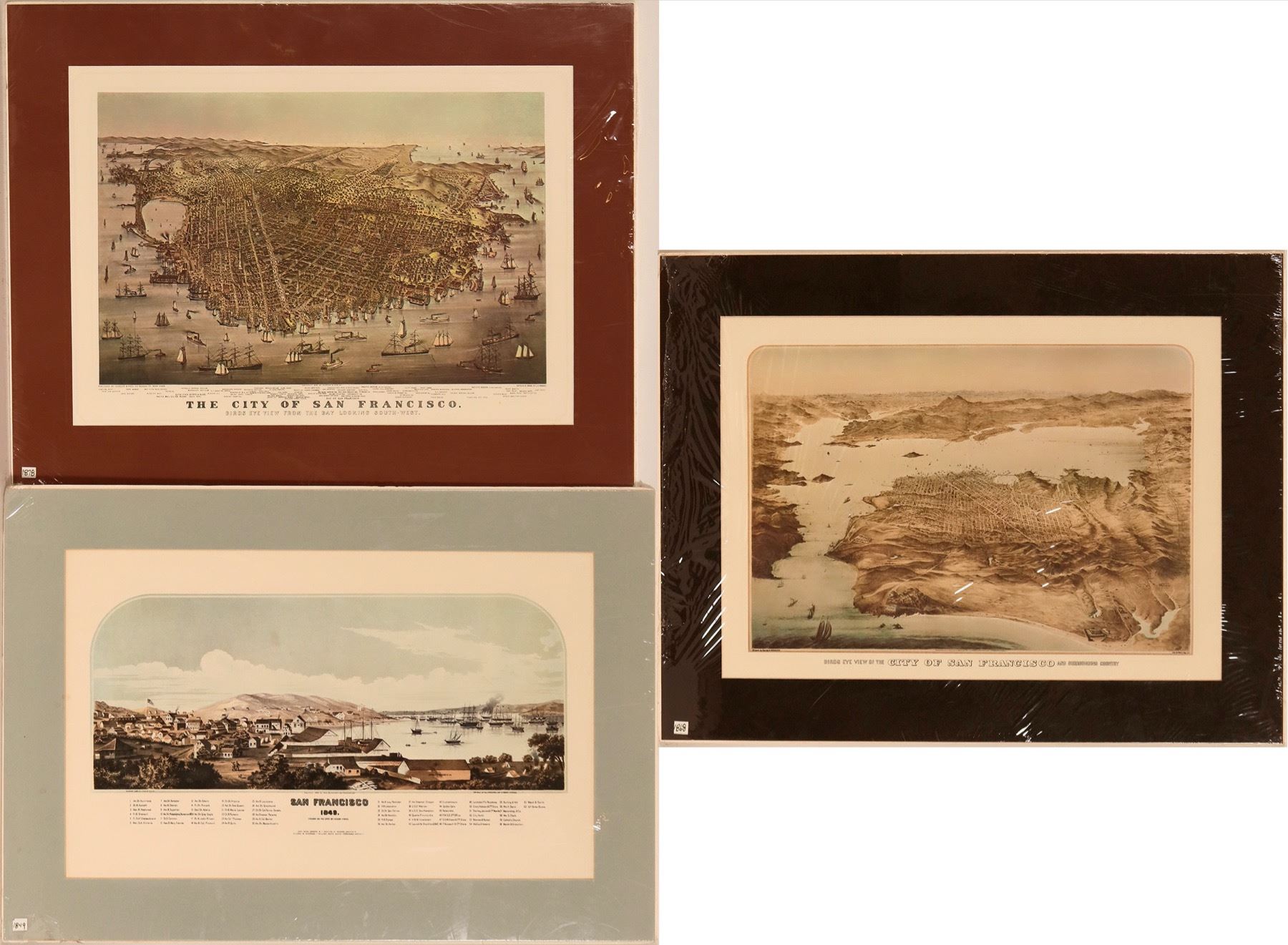 Three different San Francisco gold rush period lithos, each matted. Each are modern reprints, perfect for your office walls. A) Currier & Ives, Parsons Birds Eye view from the bay looking SW (1878; B) Britton & Rey, Goddard, Birds Eye View (1868); C) Schmidt, Burkhardt (1849). all about 19 x 25"