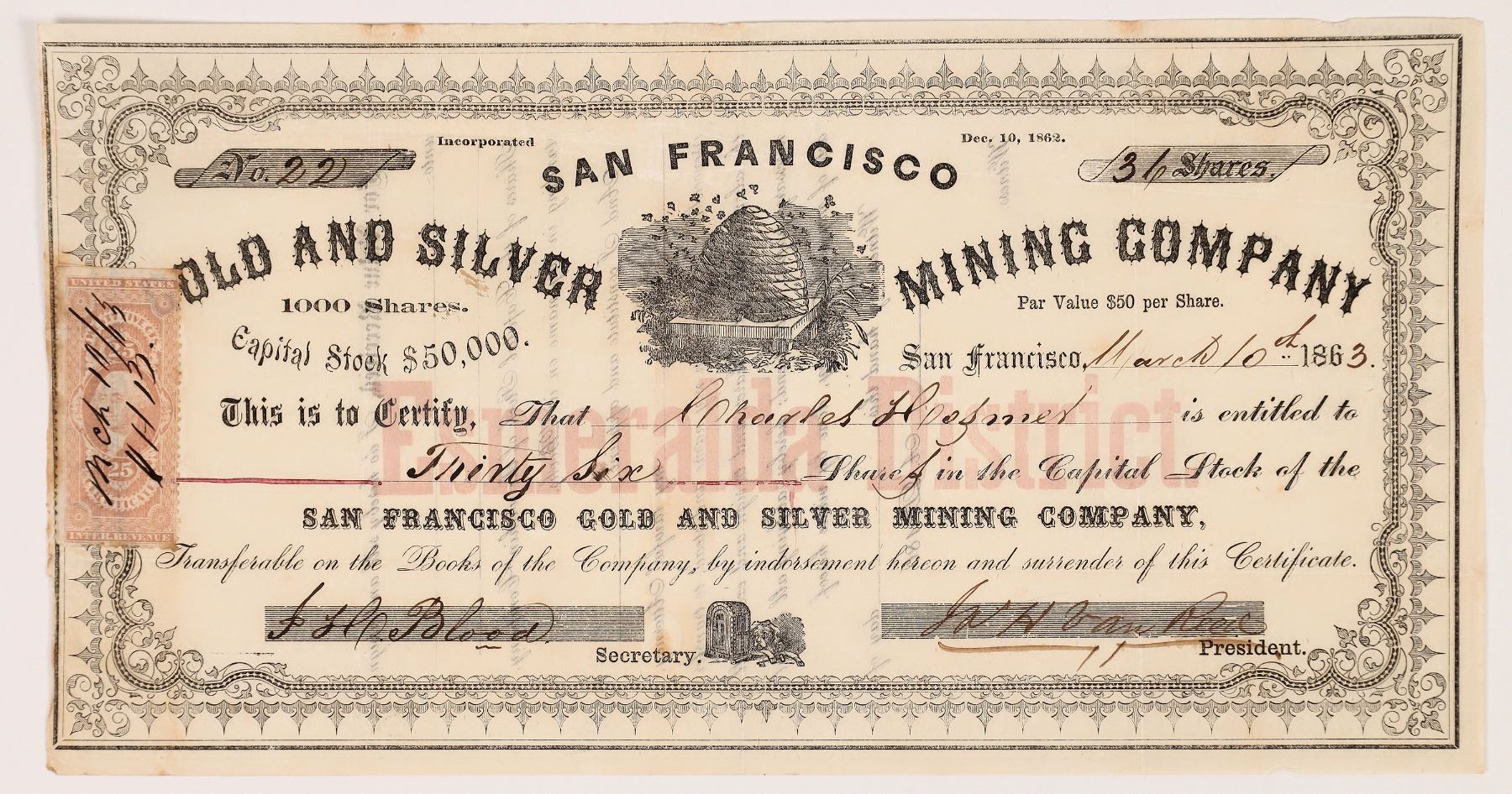 "Esmeralda District" in red underprint. Inc. December 10th, 1862. No. 22, issued to Charles Hosmer for 36 shares on March 10th, 1863 in San Francisco. Signed by president Jas. Van Reed and secretary Blood. Not cancelled. Ornate black border and print with beehive vignette. 25 cent US IR certificate stamp attached on the left. No printer listed. Folds, creases, some discoloration. 5.5 x 10" Hosmer was a mining agent in SF who was also involved in mines in Nevada. Reed is listed as a real estate agent. No information located about the mining company.