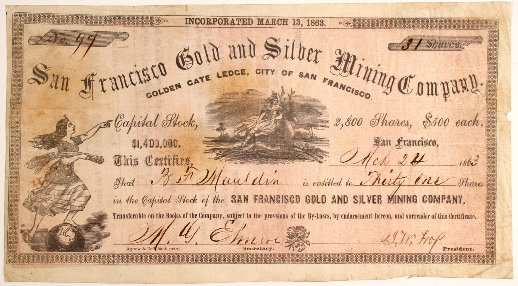 # 44 for 31 shares to BF Mauldin. Datelined San Francisco 1863. Signed by secretary Elmore and president Hof. Incorporated March 13, 1863, Location "Golden Gate Ledge, City of San Francsico." Two allegorical vignettes. Uncancelled. Printed by Agnew and Deffebach. Cut unevenly, wrinkled, some staining. Still very good! September 18, 1863 article in the Daily Alta lists the location as Silver Hill in San Bernardino. Prag Collection City: Golden Gate Ledge, San Bernardino State: California Date: 1863 HWAC# 79708