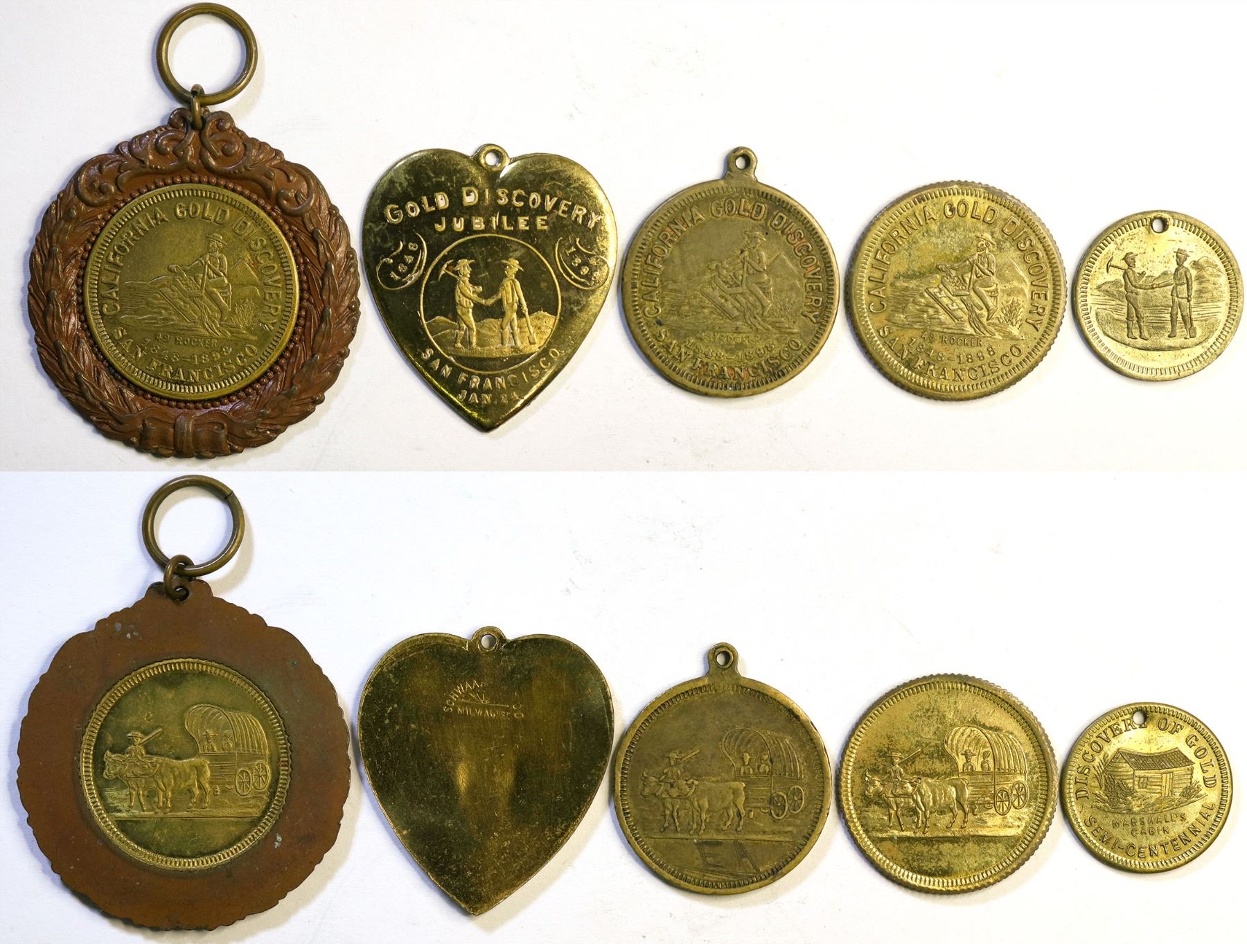 Five Schwaab Stamp & Seal medalets issued for the semicentennial anniversary of the discovery of gold in California. The smallest is 18.54mm with two miners greeting one another and Marshall’s Cabin on the reverse. The miner using a rocker with an ox-drawn covered wagon on the reverse is represented by three examples including one with an integrated loop and one inset in a wreath. The fifth is a heart-shaped badge that was marketed for women. Gold-plated brass. VF-Unc.