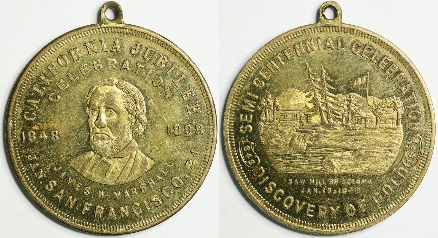 Semicentennial anniversary of the discovery of gold in California issued in celebration of the city’s Golden Jubilee. The unlisted so-called dollar companion to HK-642. Commemorates Marshall and the sawmill at Coloma. 34.91mm. Gold-plated brass. HK-unlisted. Unc with nearly intact gold plating.