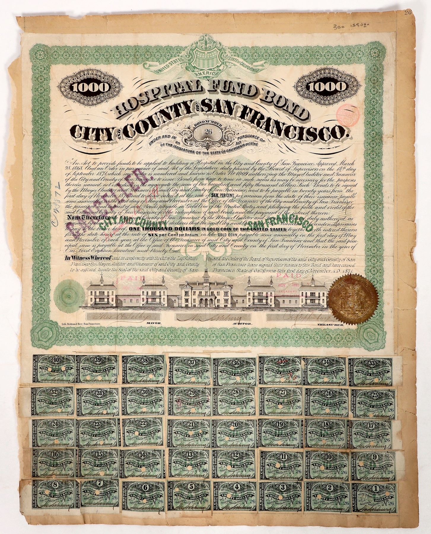 A certificate for a $1000 Hospital Fund bond issued by the City & County of San Francisco, dated 1871. No. 26 issued. Cancelled. Signed by SF mayor Thomas H. Selby with a golden embossed seal. Nice vignette. Certificate is mounted on paper with 40 attached $30 bond coupons. Some foxing and warping, esp. on coupons; see photos for more detail on condition.