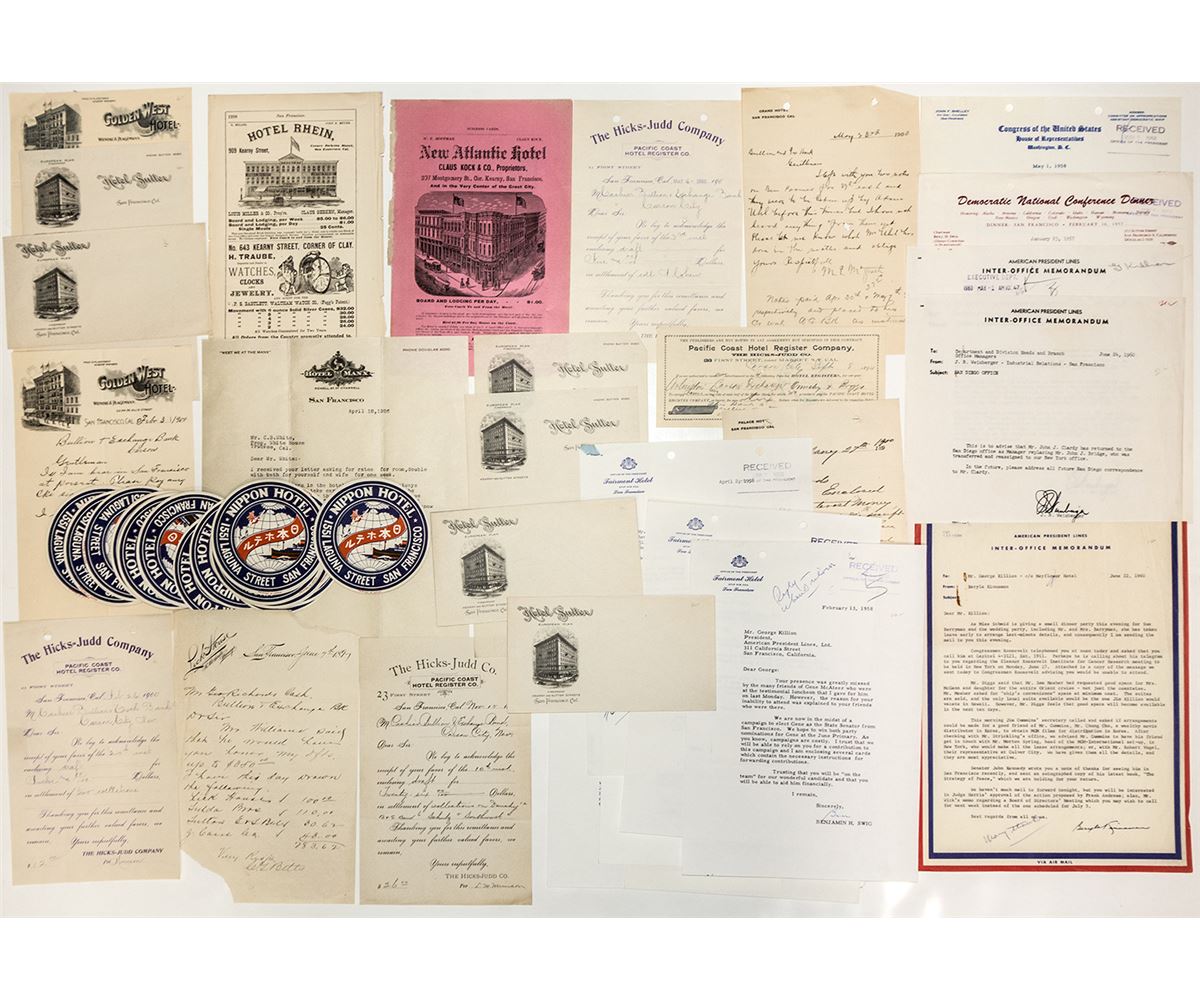 Letters, receipts, statements, ads, etc, from various San Francisco Hotels: The Hicks-Judd Company, Lick House, Golden West Hotel, Hotel Manx, Fairmont Hotel, etc.