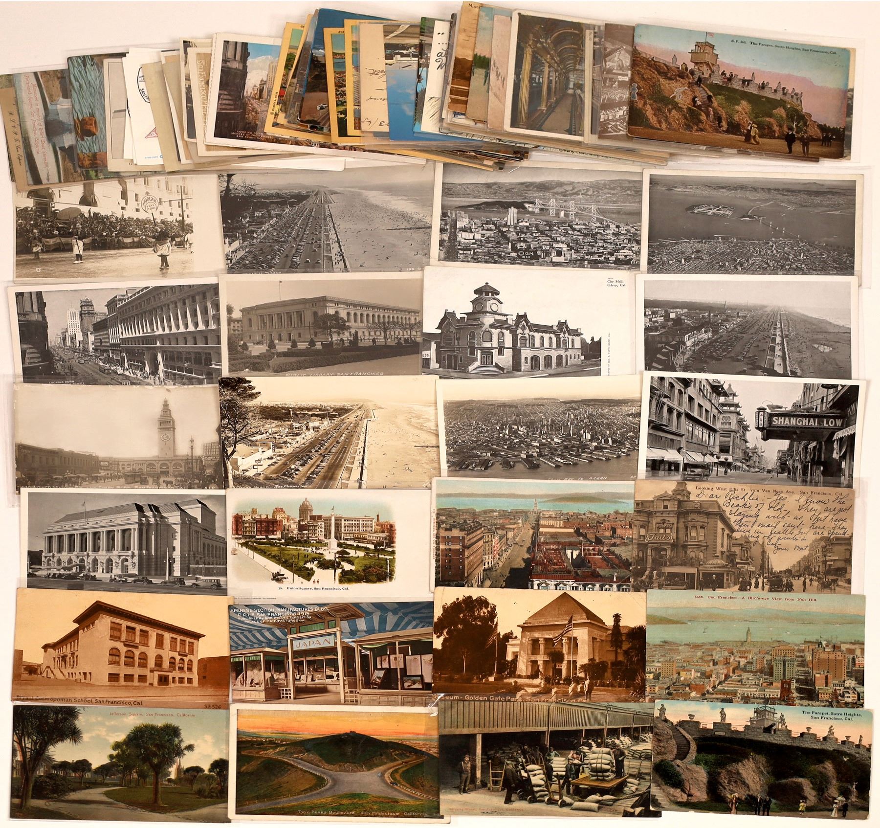 Lot of nearly 100. At least three no split back (1907 Ellis Street, 1906 Market Street, Union Square. Over 13 B&W RPC's (War Memorial Opera House, Shanghai Low, beach overview, city overview, ferry building, City Hall, Bay Bridge, etc. 1922 Shrine Official Post Card Moolaw Band of St. Louis. Two cards from the Zelinsky Collection, Mussee Mecanique, Cliff House. Many, many more. There are duplicates.