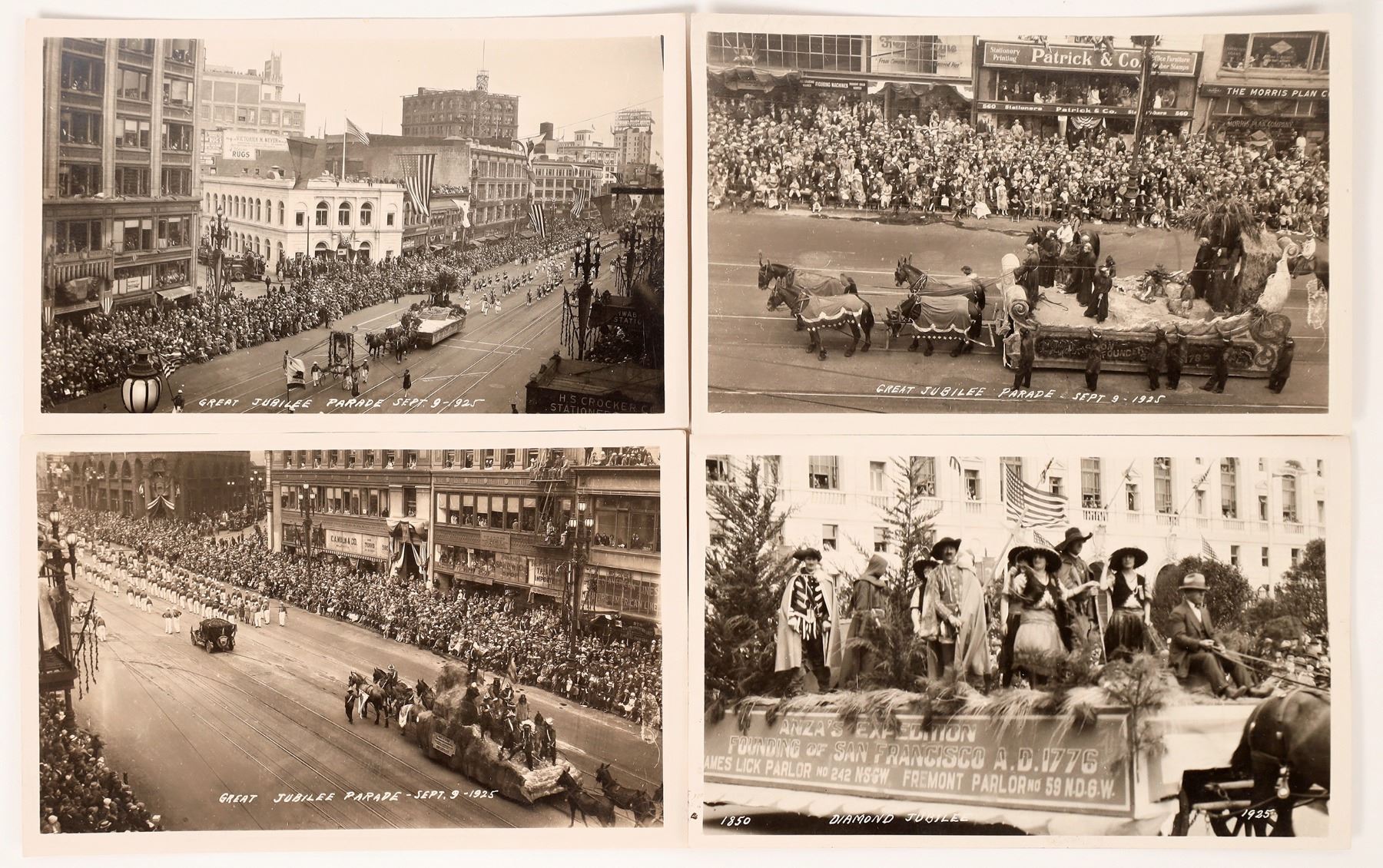 4 San Francisco Jubilee RPC's. Parade photos including 1 showing the Patrick and Co. Building, who were major makers of tokens. California San Francisco