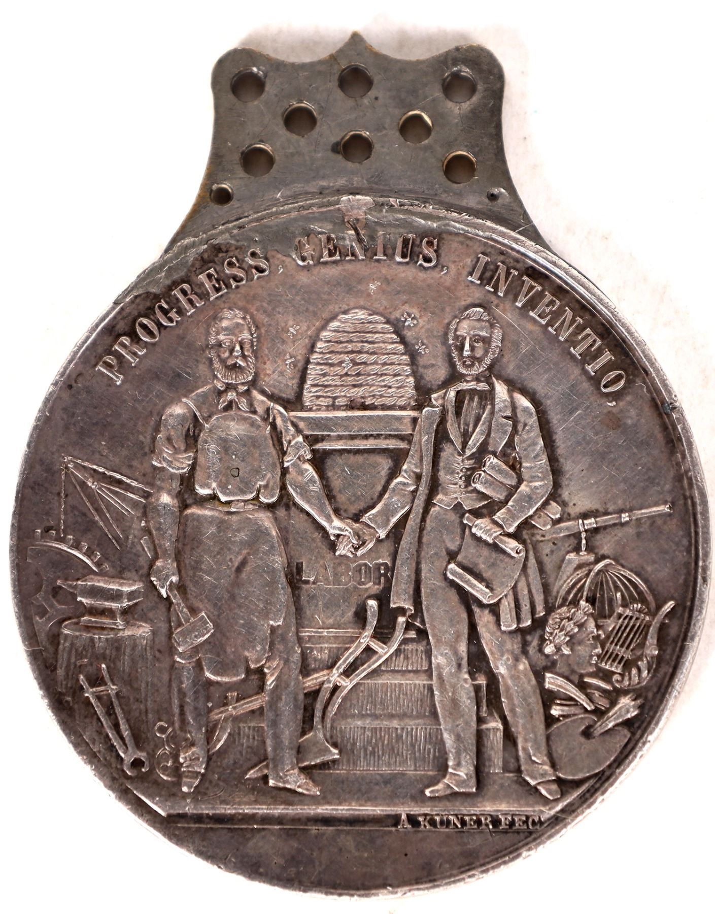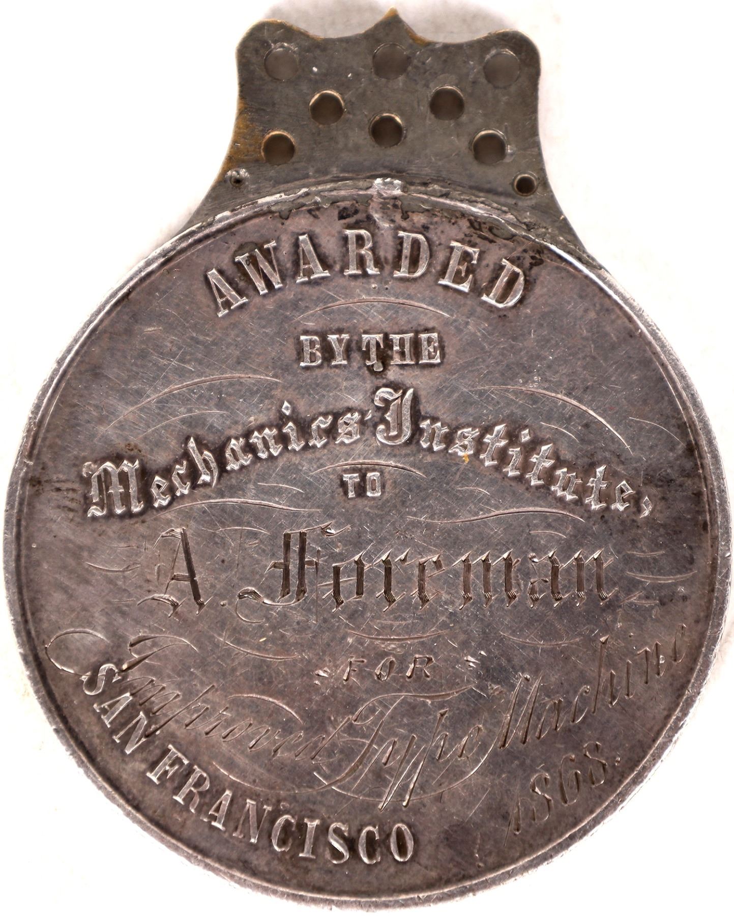 Designed by the famous Nahl Brothers. Dies executed by Albrecht Kuner. Very rare. Obv: Progress / Genius / Inventio; Rev.: Awarded / By The / Mechanics Institute / to / A. Foreman / for / Improved Type Machine / San Francisco / 1868. 42 x 50 mm. San Francisco California