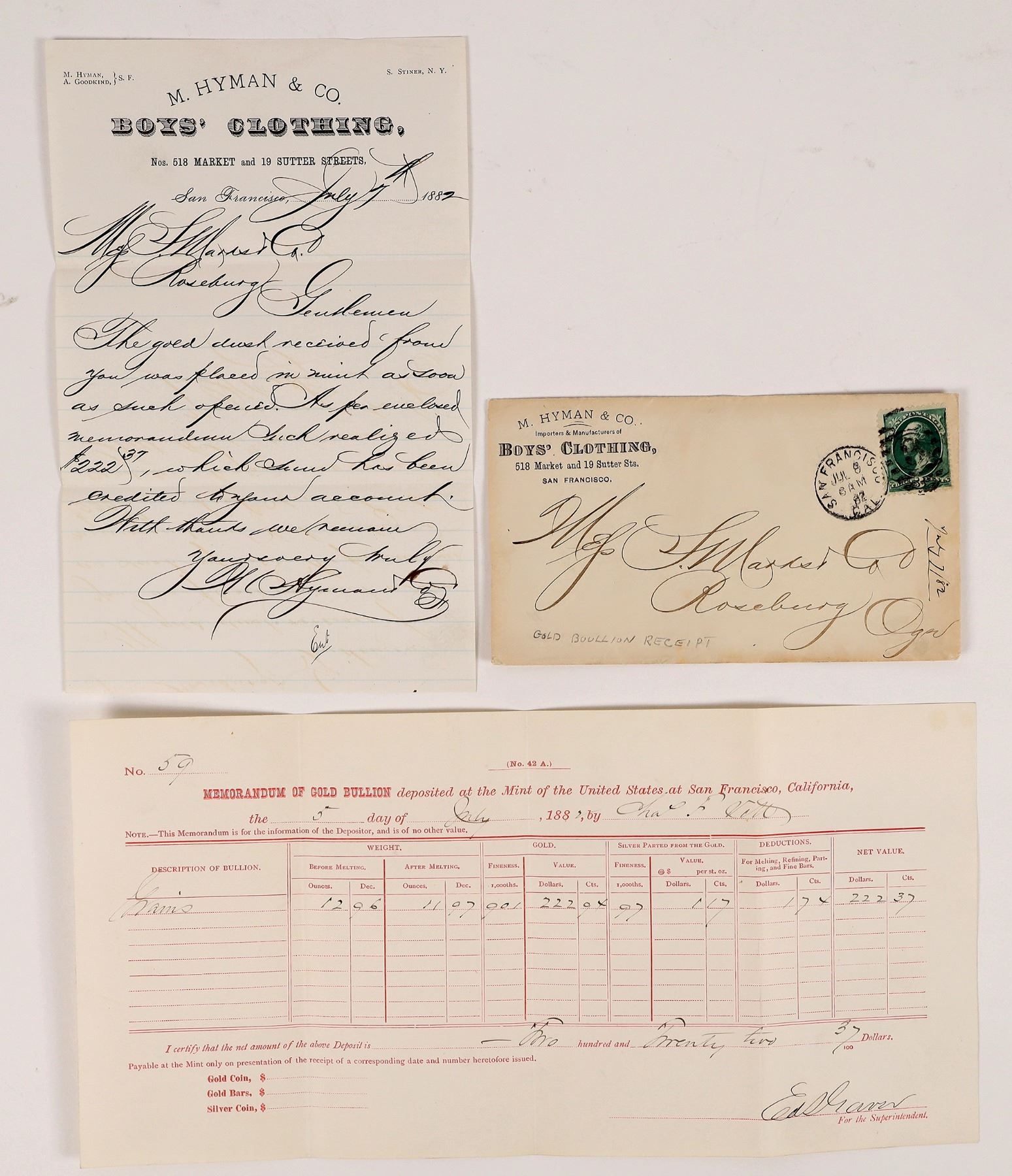Lot of 3 documents that tell a story. 1) Memorandum of Gold Bullion deposited at the San Francisco Mint, July 1882 by Chas. F. Vott. 1.96 ounces of grains, 901 gold fineness. Signed by Ed Gaver for the supt. 5.75 x 11.25" Folds. 2-3) Letter and corner ad cover for M. Hyman & Co., Boys' Clothing, San Francisco, 1882. Sent to S. Marks & Co. in Roseburg, Oregon. Letter references the bullion receipt: "The gold dust received from you was placed in mint as such opened. As per enclosed memorandum, such realized $222.37 which has been credited to your account." So gold was sent from Oregon merchants as payment to a clothing merchant in SF, who then deposited the gold at the SF Mint for payment. The whole cycle is represented here! Rare group. San Francisco California Franklin Collection