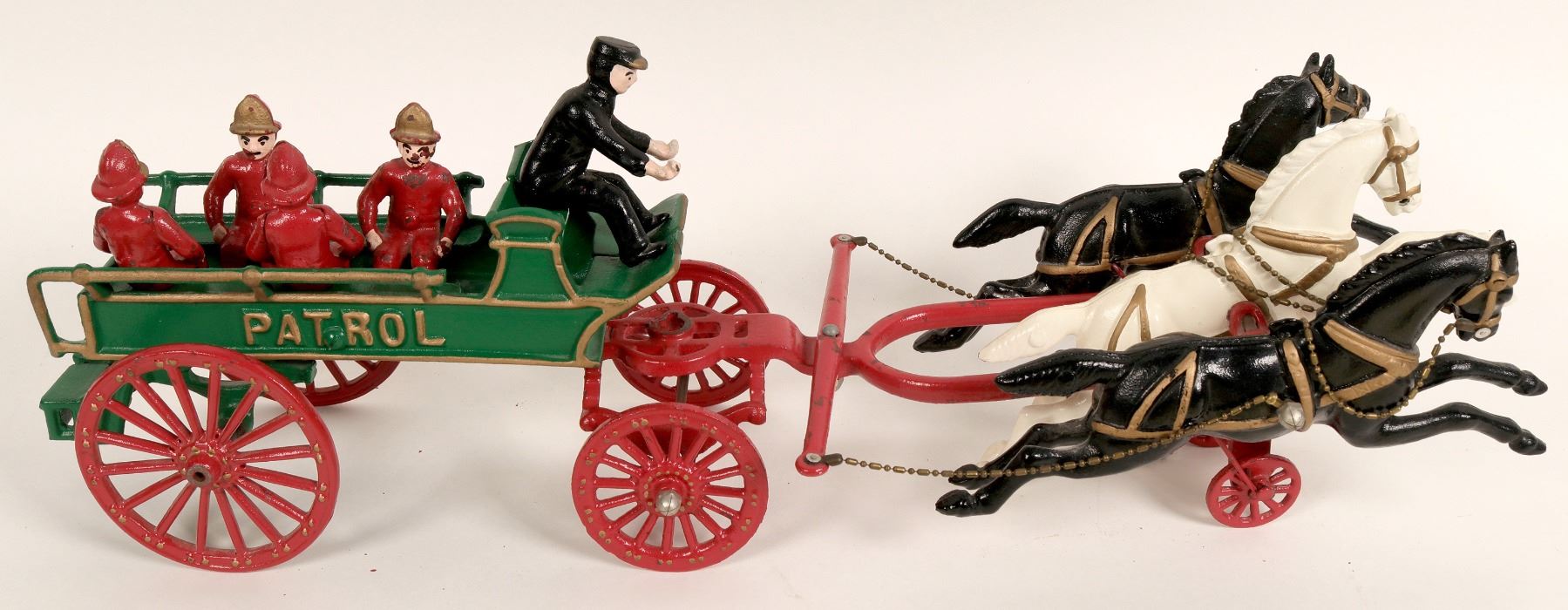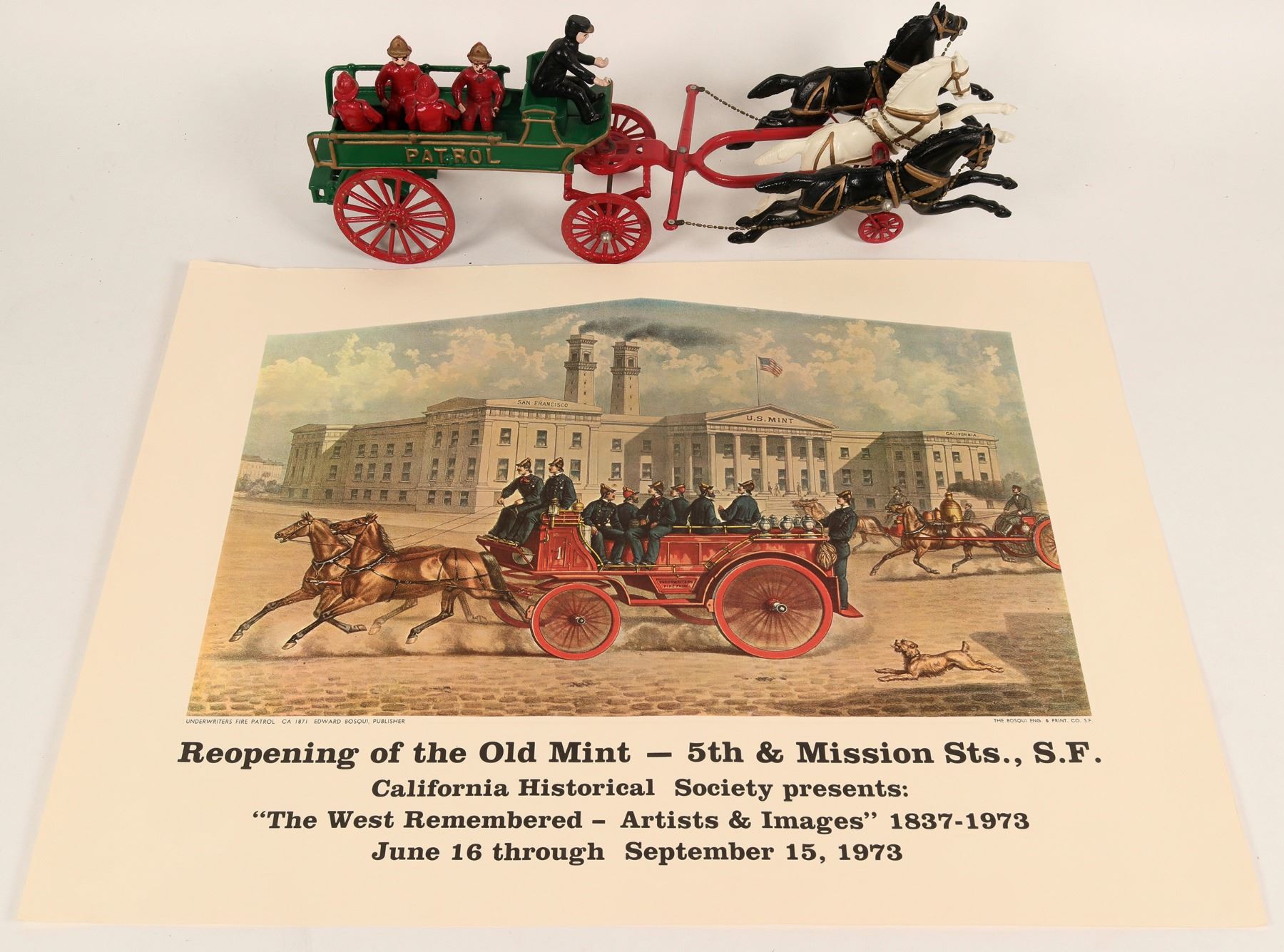 1) Reopening of the Old Mint at 5th & Mission Streets. California Historical Society Presents: "The West Remembered - Artists & Images" 1837-1973 Underwriters Fire Patrol, California 1871; 2) Wrought Iron Model Toy (Repro) of the Insurance Underwriter's Fire Patrol Wagon used in the 1870's (21" Length)