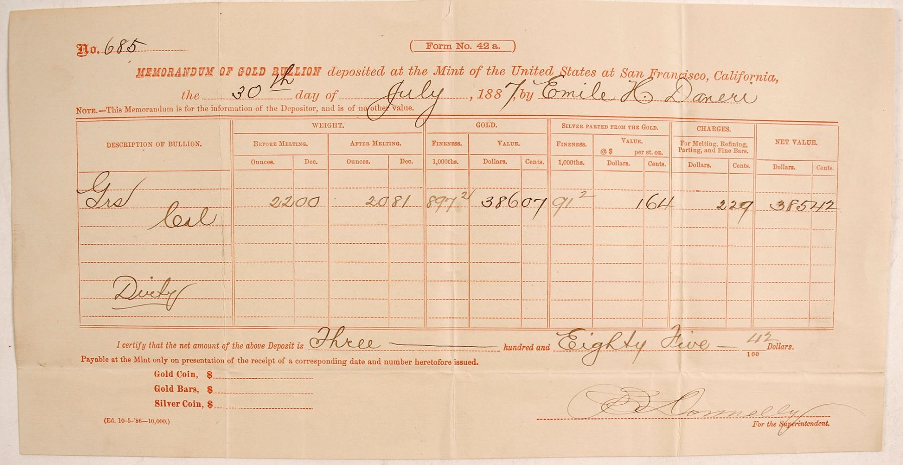 No. 685. Deposited July 30th, 1887 by Emile H. Daneria. Twenty-two ounces of California placer gold grains. Total value after melting $385.42. Signed by Connelly for the superintendent. Folds. 5.75 x 11.25" Daneri was likely a merchant that got paid in gold. Date: Location: San Francisco, California HWAC# 572069