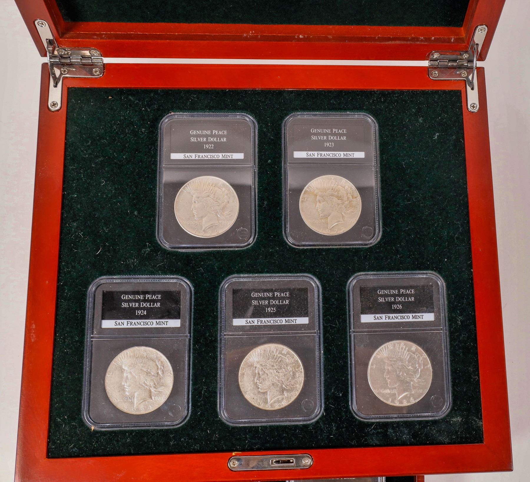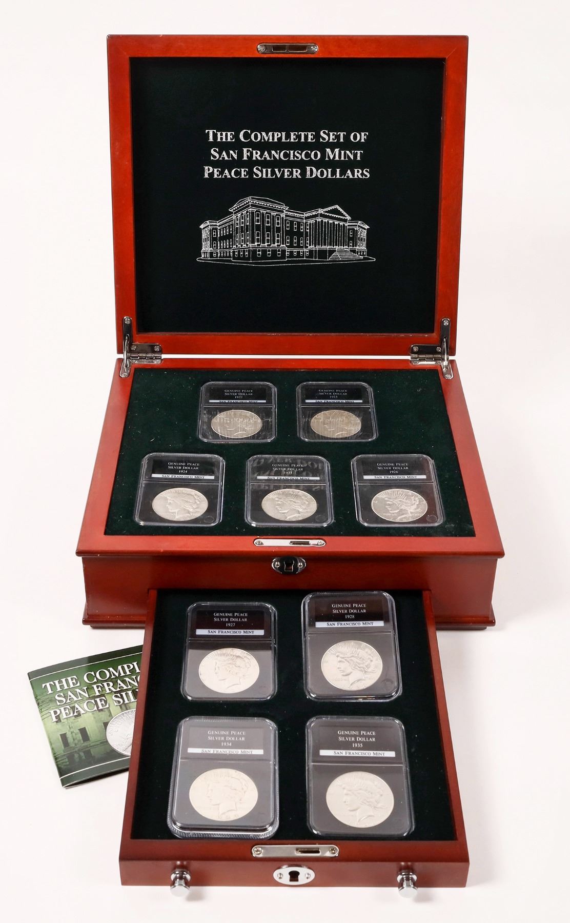 Issued by PCS Stamps and Coins: The Complete Set of San Francisco Mint Peace Silver Dollars. Nine silver "S" mint dollars: 1922, 1923, 1924, 1925, 1926, 1927, 1928, 1934 & 1935. Coins are VF-EF condition. The richly finished wooden chest (measuring approximately 10" x 4" x 9") and fascinating booklet, which outlines the history of Peace Silver Dollars and the San Francisco Mint, is included.