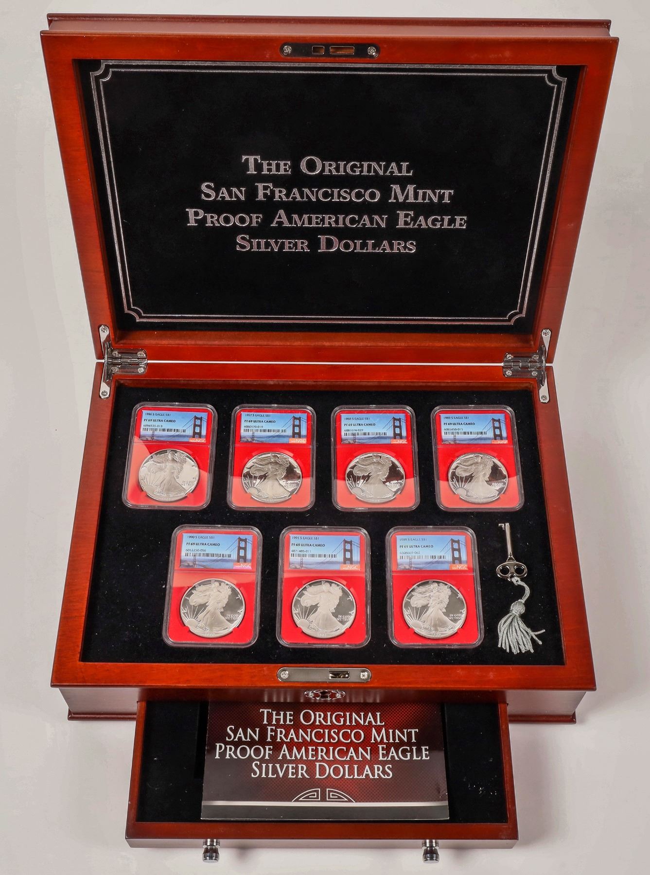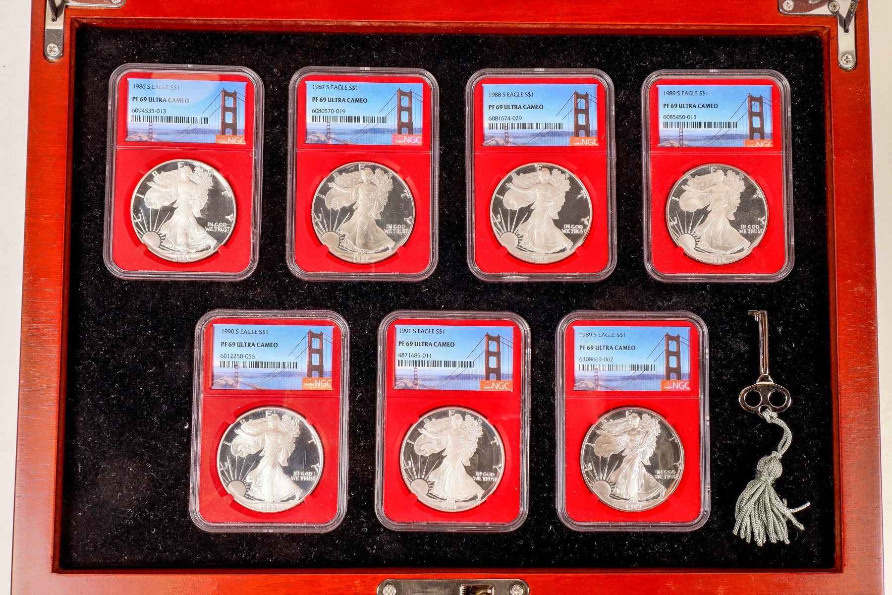 Issued by PCS Stamps and Coins: The Original San Francisco Mint Proof American Eagle Silver Dollars. Seven NGC graded PF 69 Ultra Cameo U. S. Silver Eagles dated 1986-1991 (two 1989-S). Elegant wooden box 13 x 10 x 4 inches, with color brochure explaining the history of the coins.