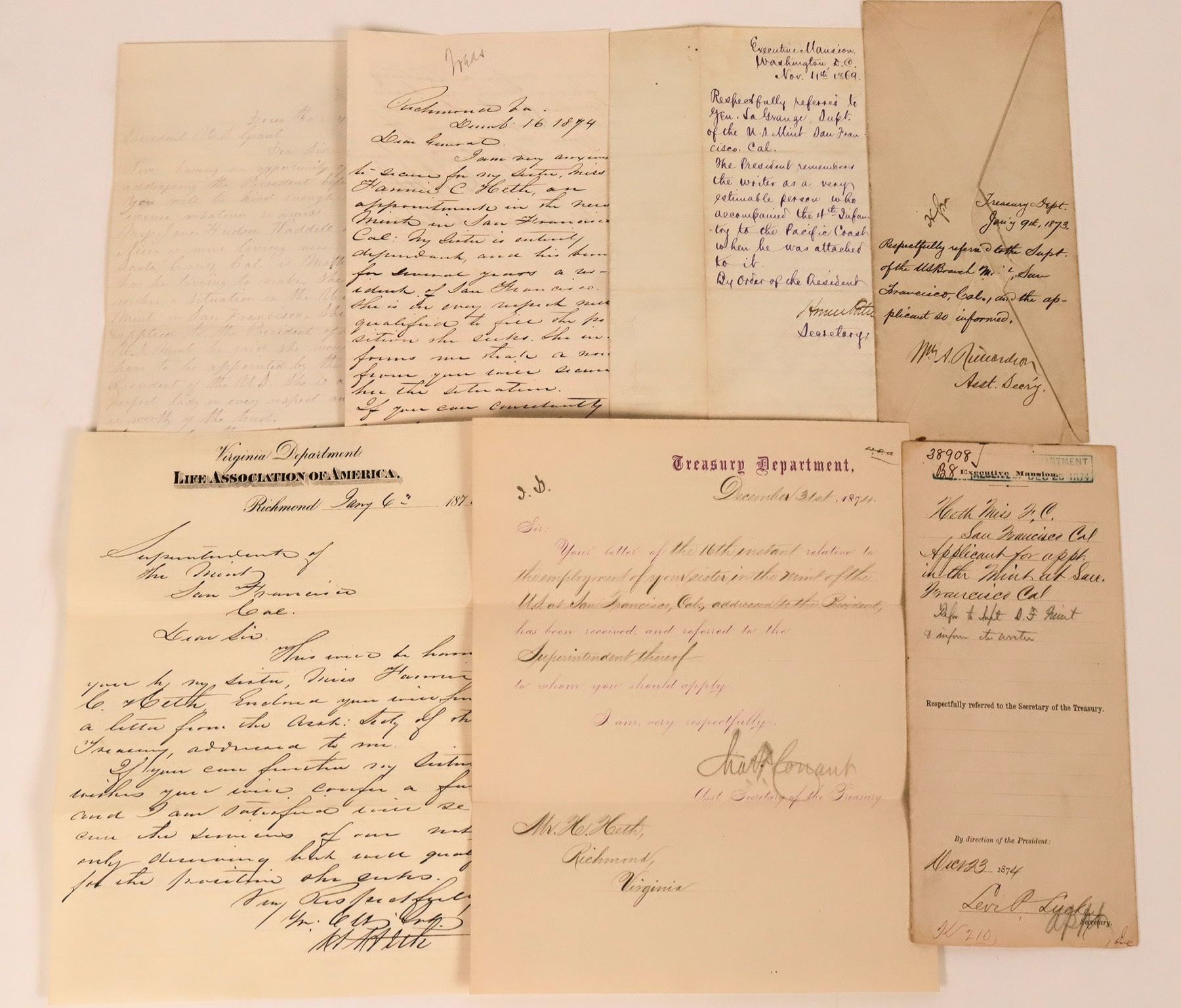 Lot of 7. US Grant served from 1869-1877. 1) Dec. 1872 letter addressed to President US Grant. Letter from Martha G. Grant (no relation?) discusses her niece Jane Hudson Waddell, living in Santa Cruz, who would like to work for the San Francisco Mint. She asked the director there but he said she would need appointment by the president. Comes with Executive Mansion cover that has hand-written message to Treasury Dept., Jan. 9th, 1873, recommending applicant. 2) 1869 letter written from Lydia Gardner of San Francisco, addressed to "Mr. President." Message reminds President Grant that he knows her from the 4th Infantry. Her husband has died, and she has heard "There is a number of women who perhaps have not the claim that a soldiers daughter has employed in the Branch Mint...and I would like to be employed there." Back of letter had message written from the Executive Mansion by a secretary referring Lydia Gardner to General La Grange. "The president remembers the writer as a very estimable person who accompanied the 4th Infantry to the Pacific Coast when he was attached to it." 3) Three pieces of correspondence and a cover. December 1864 letter from Heth asking for a job for his sister, Fannie. Addressed to "General." Dec. 1864 letter from Treasury Department acknowledging the letter had been received and referred to the Mint Supt. Finally, a Jan. 1865 letter from Heth to the Supt. of the SF Mint about the previous letters and recommendation from the President.