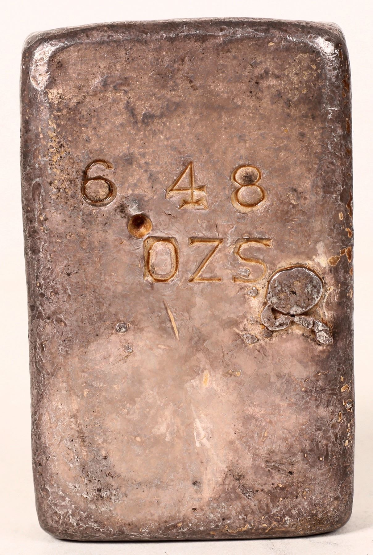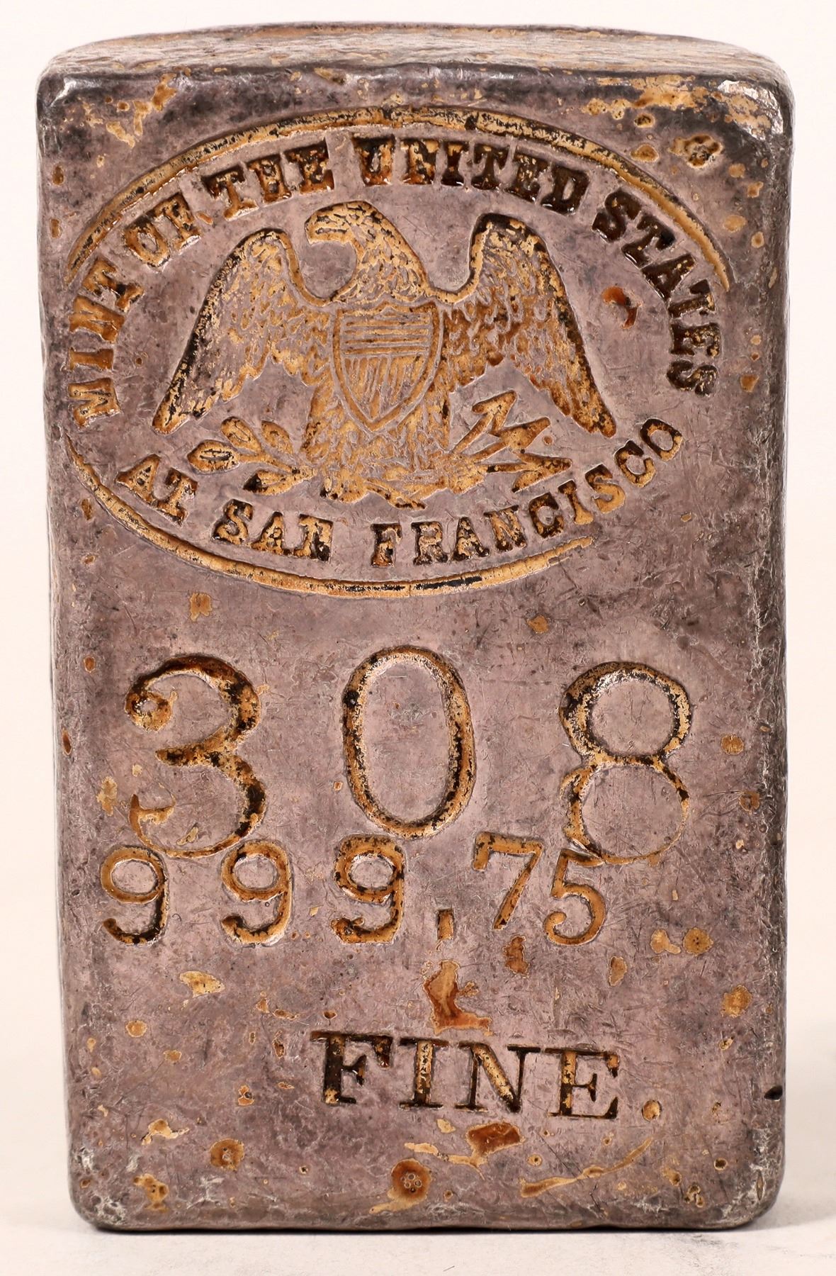 Type one oval hallmark spread eagle stamp, slightly off center toward the left side. 999.75 fine, 6.48 oz. Inventory number 308. 32 x 52 x 13 mm. Curved stem "9s". Undated, but probably minted in the 1930s.