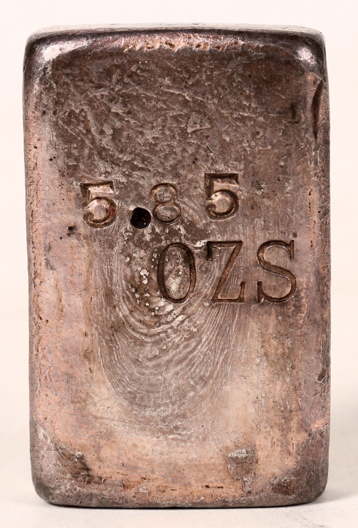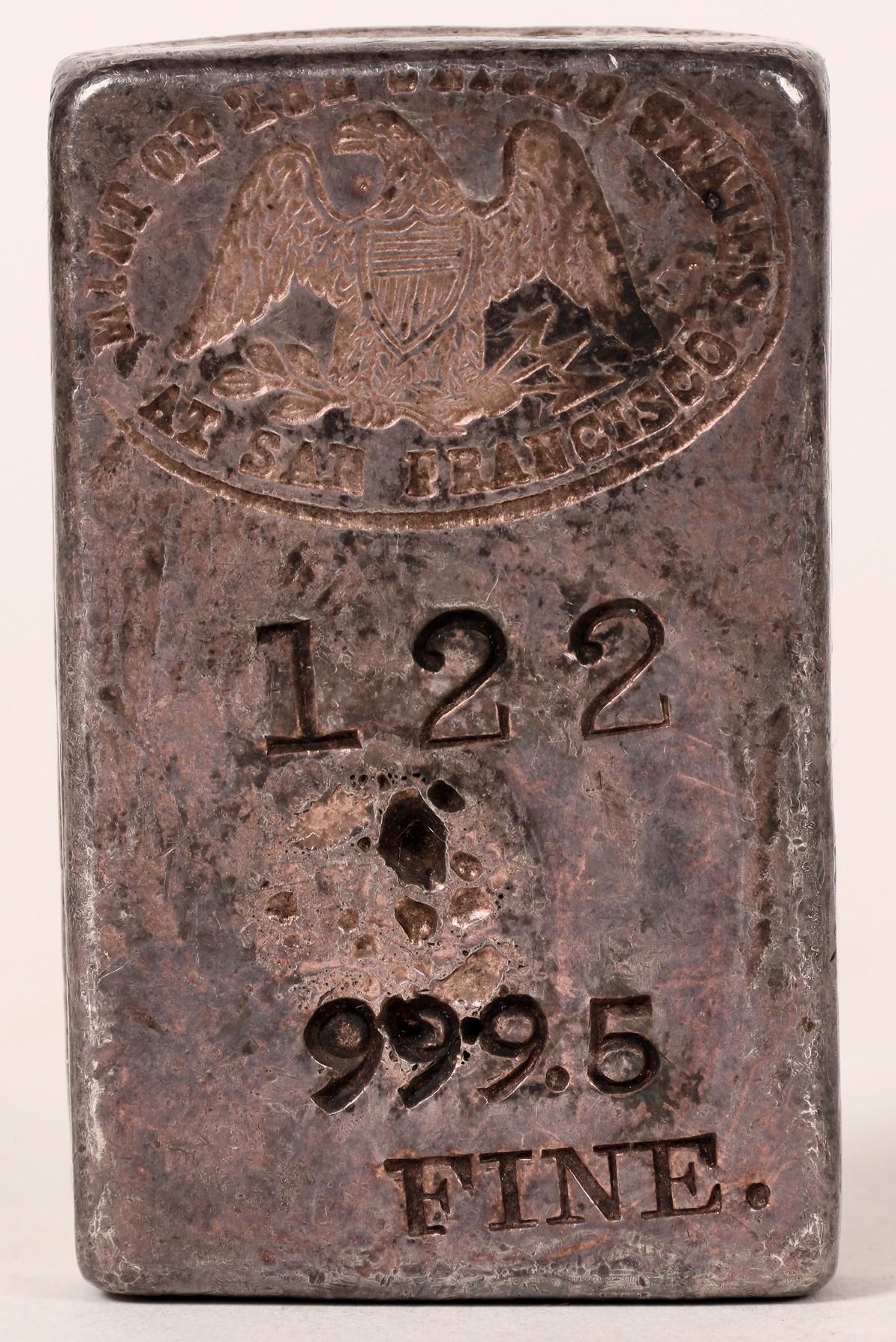 Type one oval hallmark, a bit high on the bar. 999.5 fine (straight nines), inventory #122. 5.87 ounces. Number "7" imprinted lower edge. Undated, probably 1930s-40s. 32 x 52 x 11 mm.