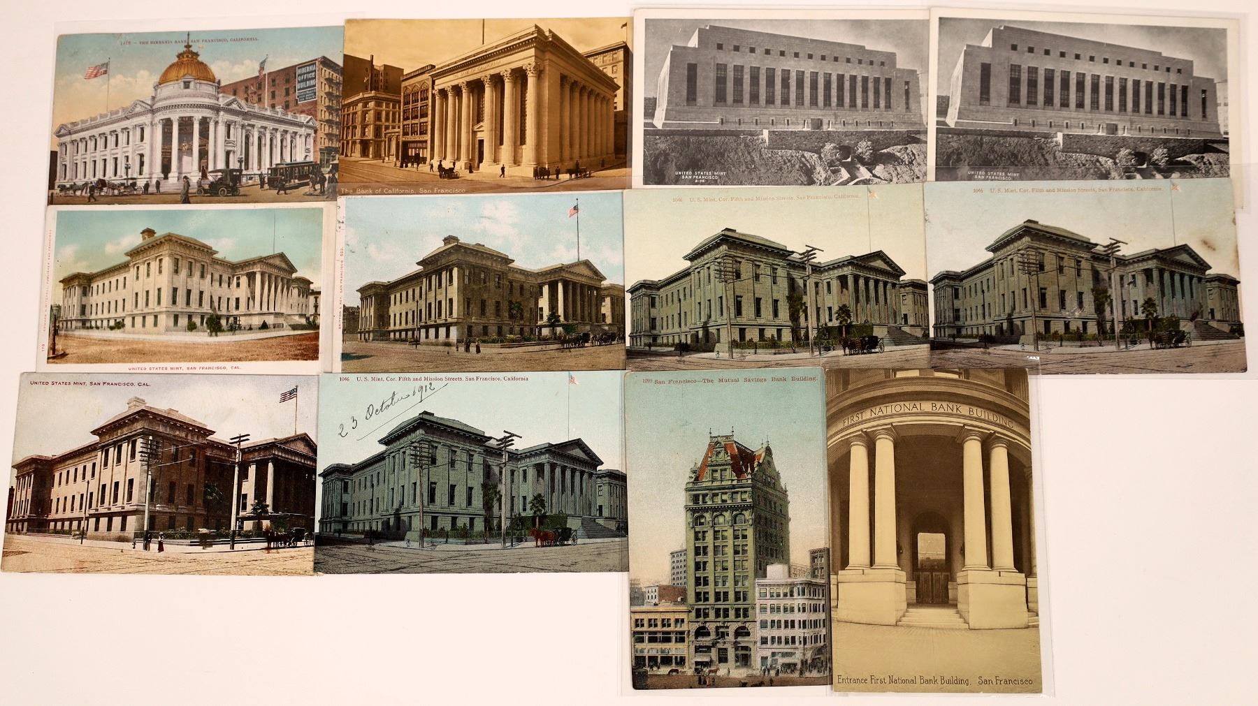 Lot of 12. Two early 'This side of address only' on reverse. Both show the mint. Two US Mint RPC's. Banks are Bank of California, Hibernia, Mutual Savings, First National Bank.