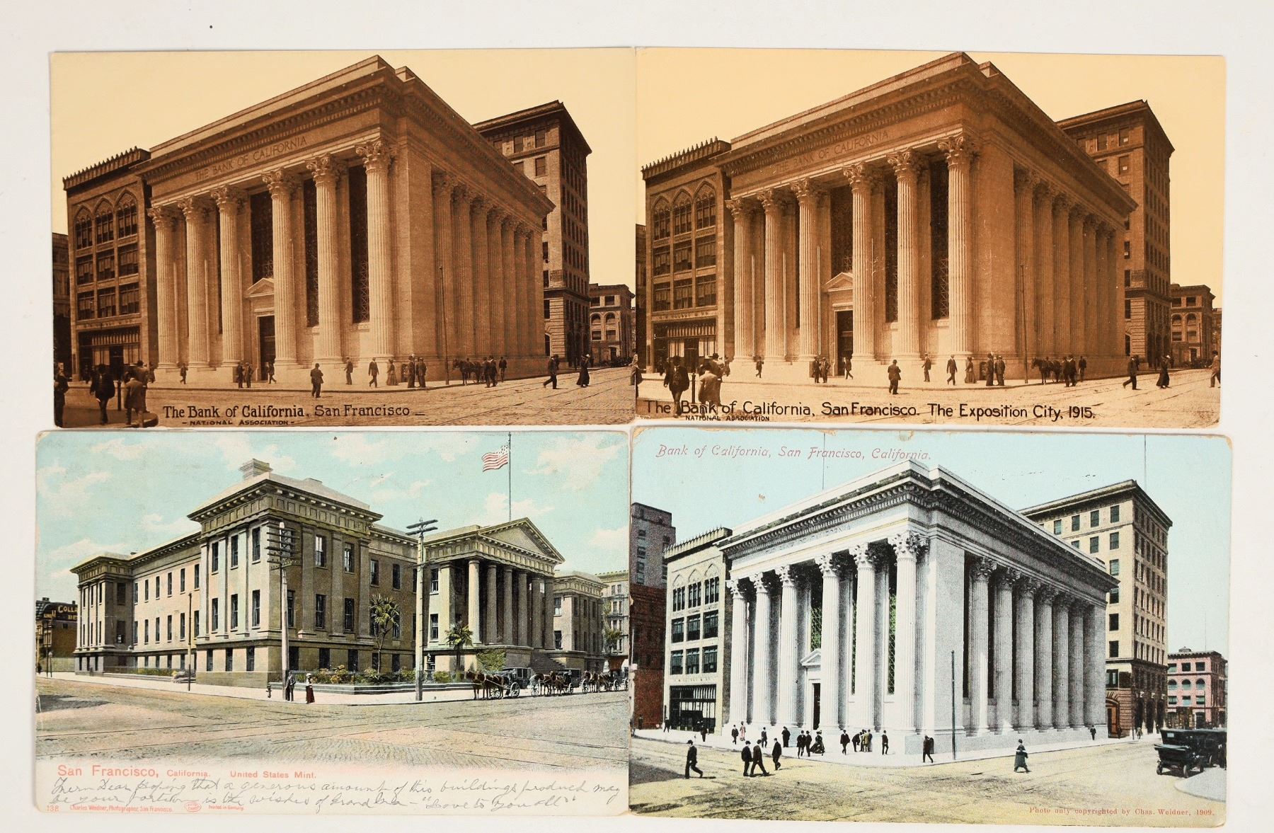 A collection of 4 postcards from the San Francisco Mint, and The bank of California.