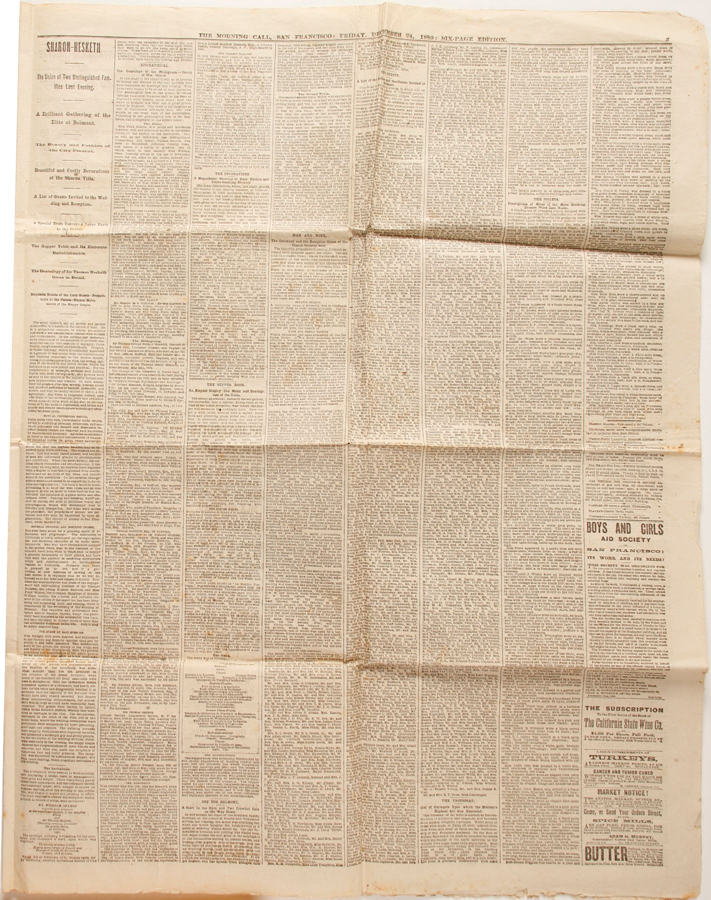 Long article about William Sharon of the Comstock. Daughter of Nevada Senator has title California Girl Lady Hesketh, Was Miss Sharon Wedding an event of 1880 London, July 31.— Lady Hesketh was one of the well-known titled American women in London. She was Florence Emily, daughter of the late William Sharon, who was one of the 49ers & at one time Senator from Nevada. Her husband, Sir Thomas Hesketh, is the seventh descendant of his line. The wedding of Florence Sharon to Sir Thomas Hesketh took place at her father’s magnificent home at Belmont, near San Francisco, in 1880 and was on a scale characteristic almost of royalty. Sharon, who had made many millions of dollars out of the development of the Comstock lode in Virginia City, who had founded the Bank of California with W. C. Ralstoon & D. O. Mills, and who had built the Palace hotel at San Francisco, was then considered one of the richest men in the world, and he determined to have a ceremony & reception in honor of his daughter’s marriage to the wealthy young baronet that should leave its mark for lavishness in the social history of California. Special trains were run from the Southern Pacific station at Fourth and Townsend streets, to convey the guests to the scene. And there were thousands of these guests. They came from all over California. Every public official, all the members of the Party. Bohemian & Union clubs, & other social organizations, the officers of the army, the navy & the militia, members of the legislature. Congressmen—everybody. The grounds had been decorated at heavy expense & with considerable display of taste, & presented a beautiful sight when the people arrived. Sharon, himself, was on hand, all smiles. After the ceremony there was a reception & a supper. (Sacramento Union, August 1, 1909.) From the Salvatore Falcone Collection.