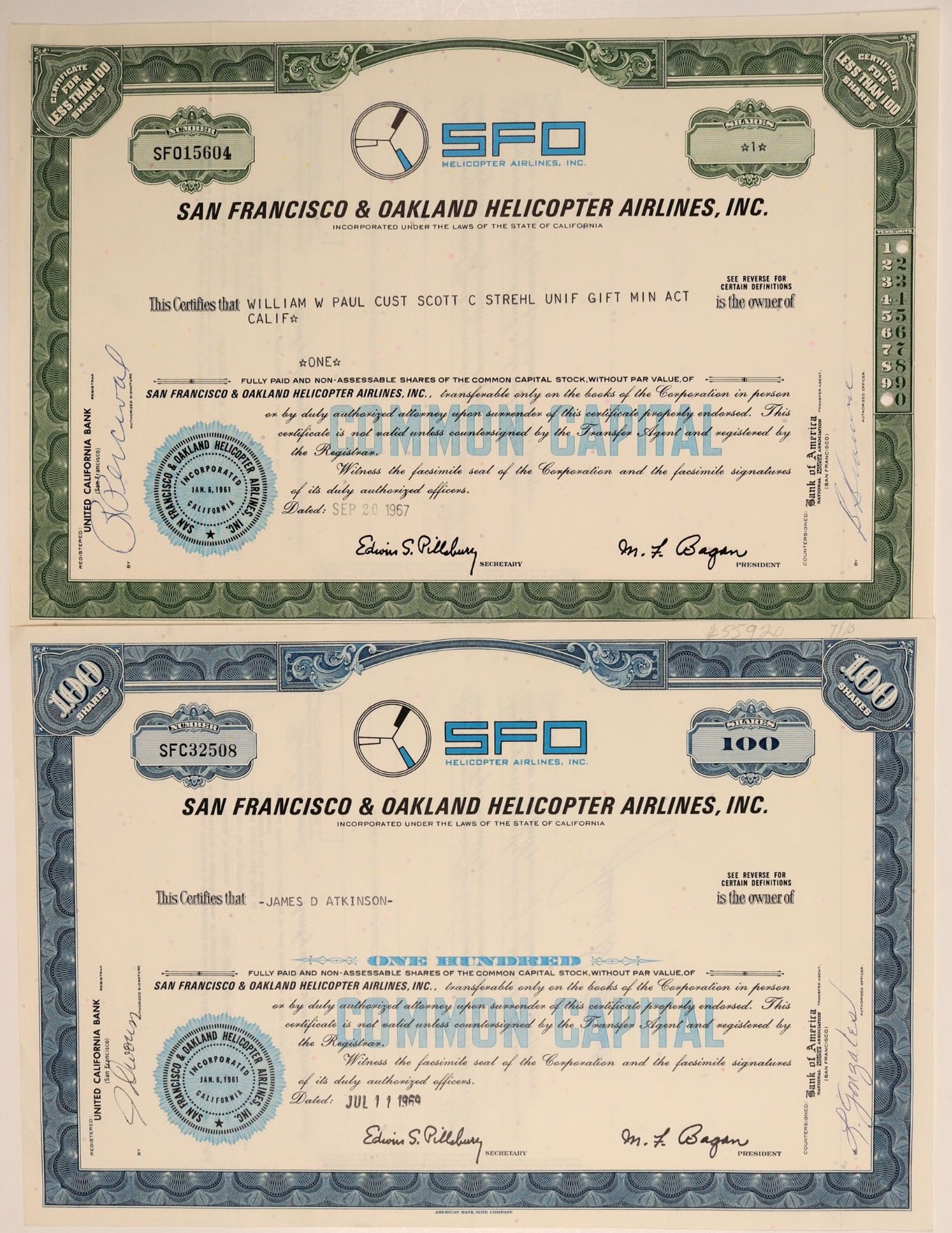 Lot of 2 different. Issued in 1967 and 1969, neither cancelled. Blue or green borders, logo with propeller blade vignette. ABN. Printed corporate signatures. Folds, staple holes. 8 x 12" Operated 1961-1986. City: San Francisco State: California Date: 1967, 1969