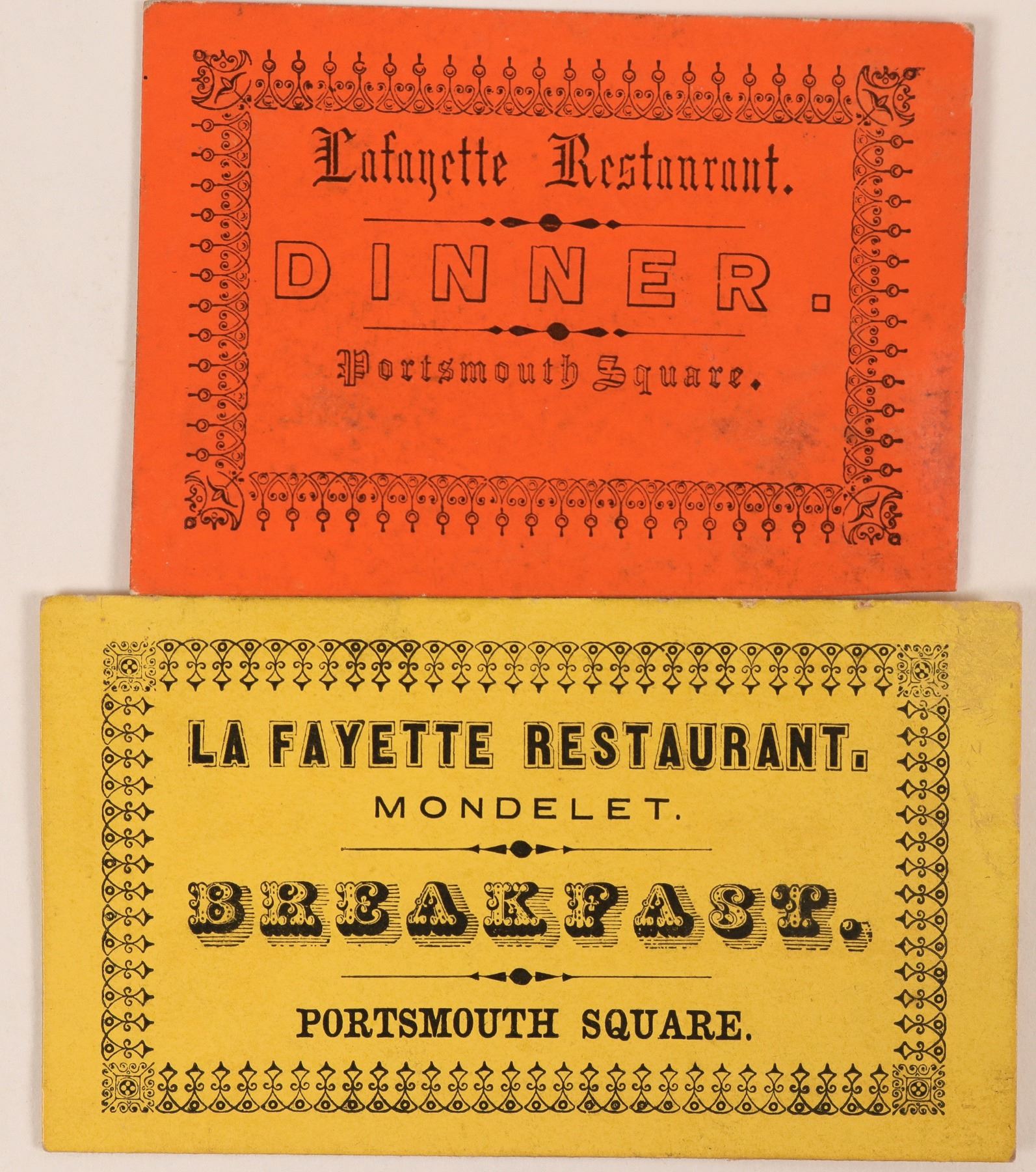 Lot of two: yellow cardboard, La Fayette Restaurant / Mondelet / Berakfast / Portsmouth Square ; orange cardboard, Lafayette Restaurant Dinner / Portsmouth Square. Ex Ron Lerch Collection