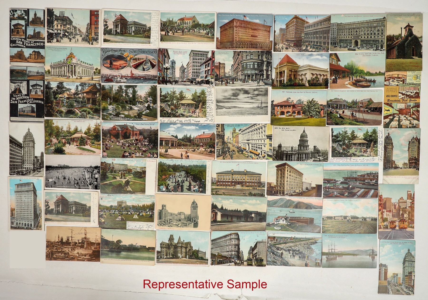 Over approx. 85 postcards. Includes one booklet of 10 views. Various bldgs. street scenes, harbor, Golden Gate Bridge. In very good cond.