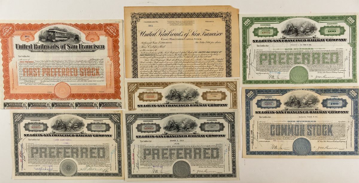 Lot of seven. Includes: St. Louis-San Francisco Railway Company (five stocks, four different, issued 1930-1945, not cancelled, locomotive vignette), an unissued stock for United Railroads of San Francisco (190-, toning and chipped corner) and an unissued colorful stock for the same company (c.1908) with thirty coupons attached. (Prag Collection) City: San Francisco State: California Date: 1930-1945 hwac# 34608