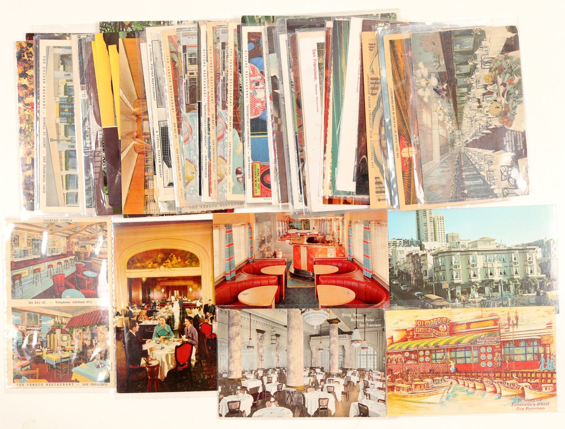 Approx. 60 postcards from San Francisco Restaurants from early 1900's to mid century. Features: Lehr's Greenhouse restaurant and florist; The Veneto Restaurant; San Francisco Chinese Restaurant, & many more. Salvatore Falcone Collection