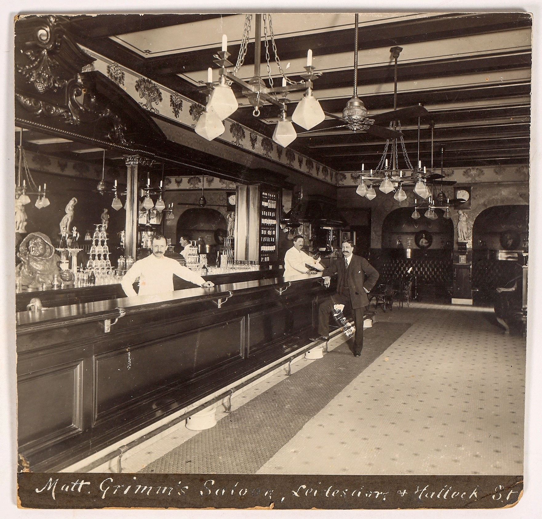 A photograph of the interior of Matthew Grimm's Saloon of San Francisco, California, taken c. early 1900s. 8 x 8 inches. Mounted on hard board. Handwritten text at bottom reads 'Matt. Grimm's Saloon, Leidesdorf & Halleck S.F.'. Grimm himself was arrested in 1900 for failing to close his saloon on election day. Excellent focus, good contrast, good condition for its age with some wear around the edges and minor damage near the center.