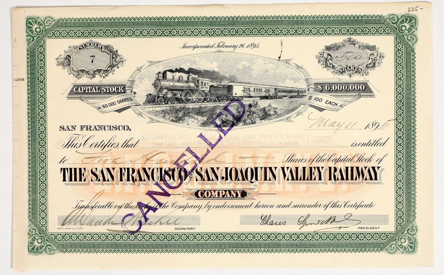 Low cert. no. 7, issued in 1895 to a group of trustees including AB Spreckels. Signed by Claus Spreckels as president and the secretary. Stamp cancelled. Green border, black print, and nice locomotive vignette. 7.2 x 11.25 Claus Spreckels was a major industrialist in Hawai'i during the kingdom, republican and territorial periods of the islands' history. He also involved himself in several California enterprises, most notably the company that bears his name, Spreckels Sugar Company. The San Francisco and San Joaquin Valley Railroad was a California rail line between Stockton and Bakersfield constructed in the late 1890s and very shortly thereafter purchased by the Atchison, Topeka and Santa Fe Railroad and became their Valley Division.