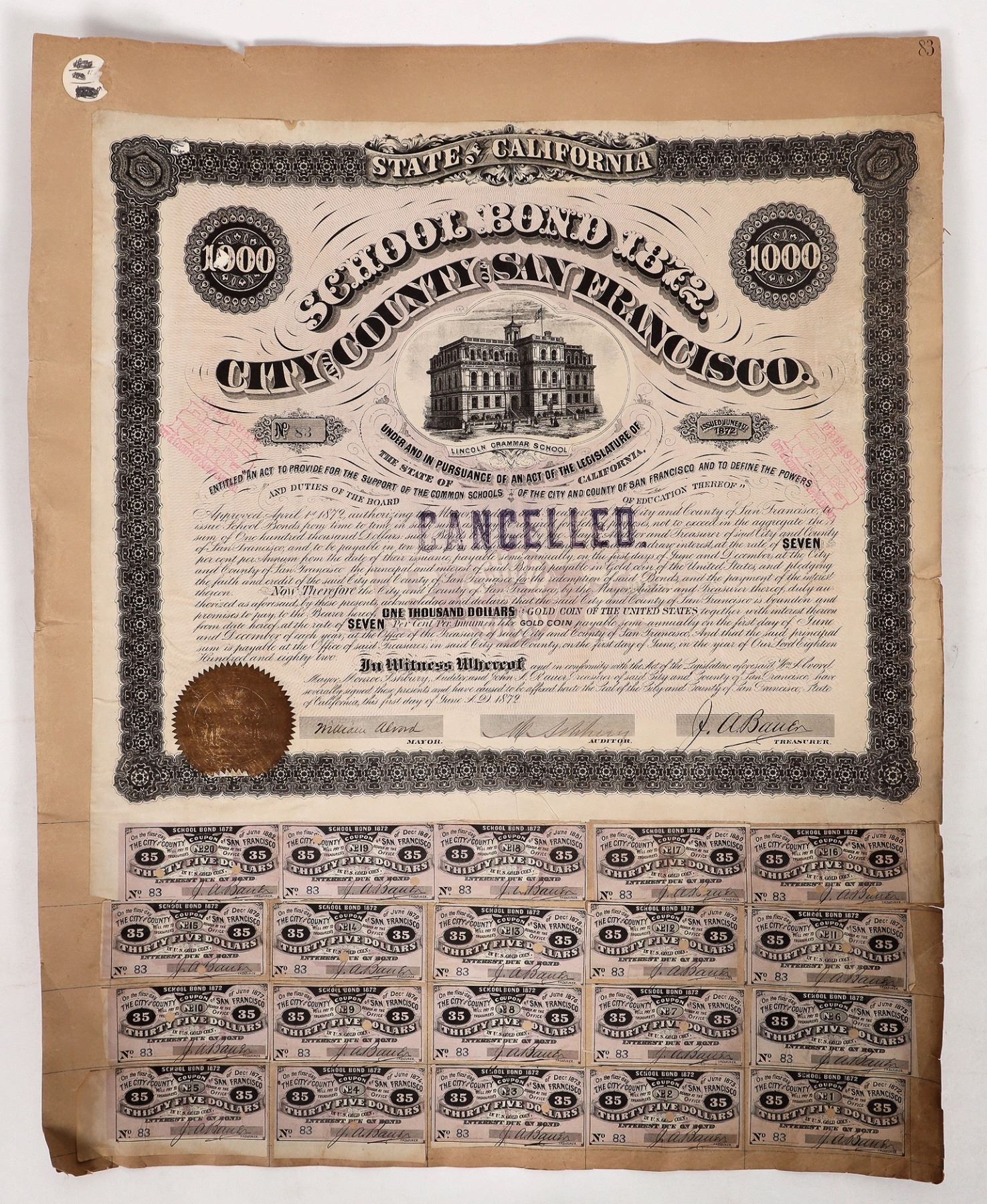 A certificate for a $1000 school bond from the City & County of San Francisco, dated 1872. No. 83 issued. Cancelled. Signed by SF mayor William Alvord. Certificate is mounted on a piece of paper along with 20 bond coupons, each worth $35. Excellent vignette of the Lincoln Grammar School which would later be destroyed in the 1906 earthquake. Minor tearing and warping, some toning -- see photos for details of condition.