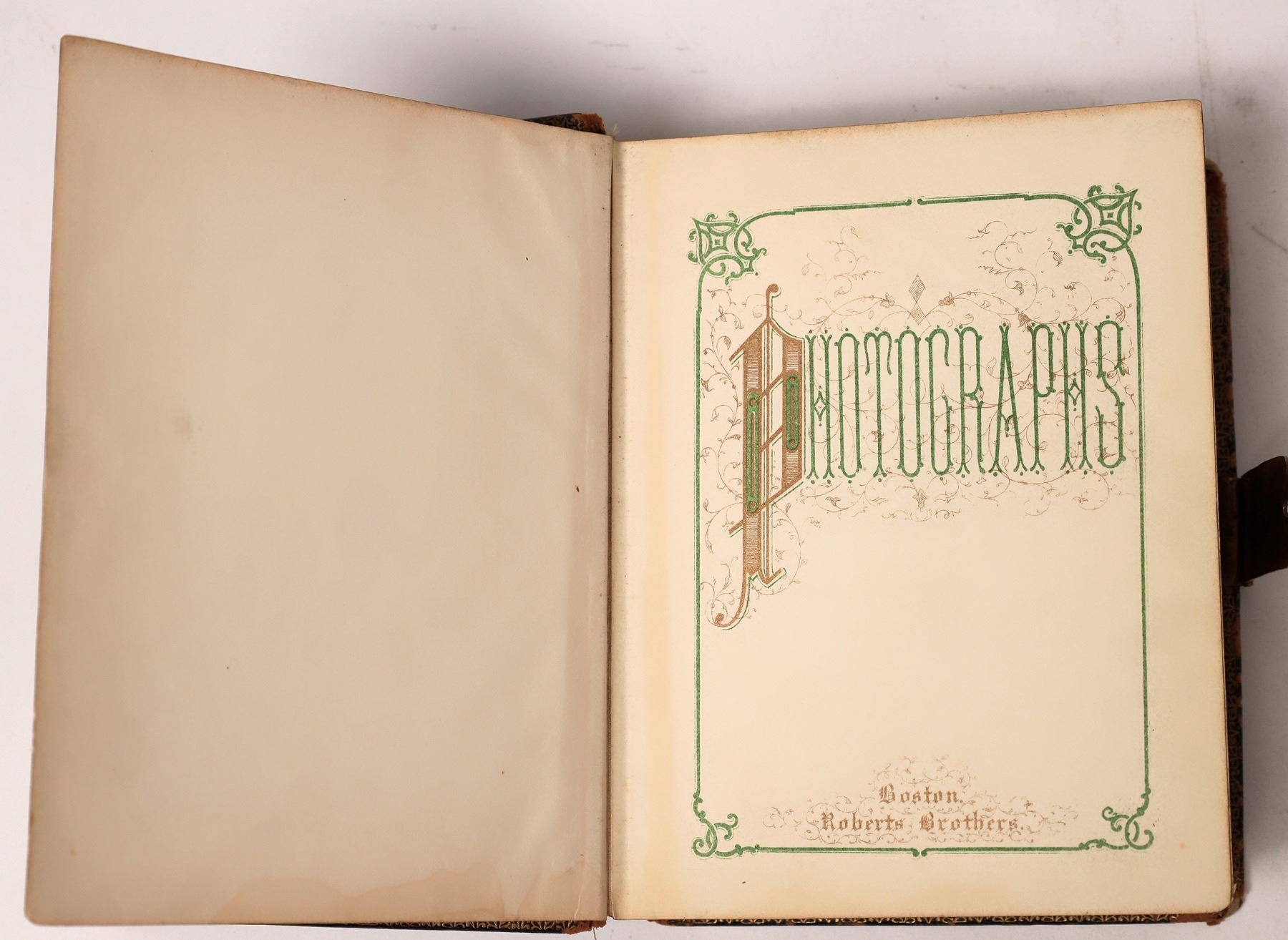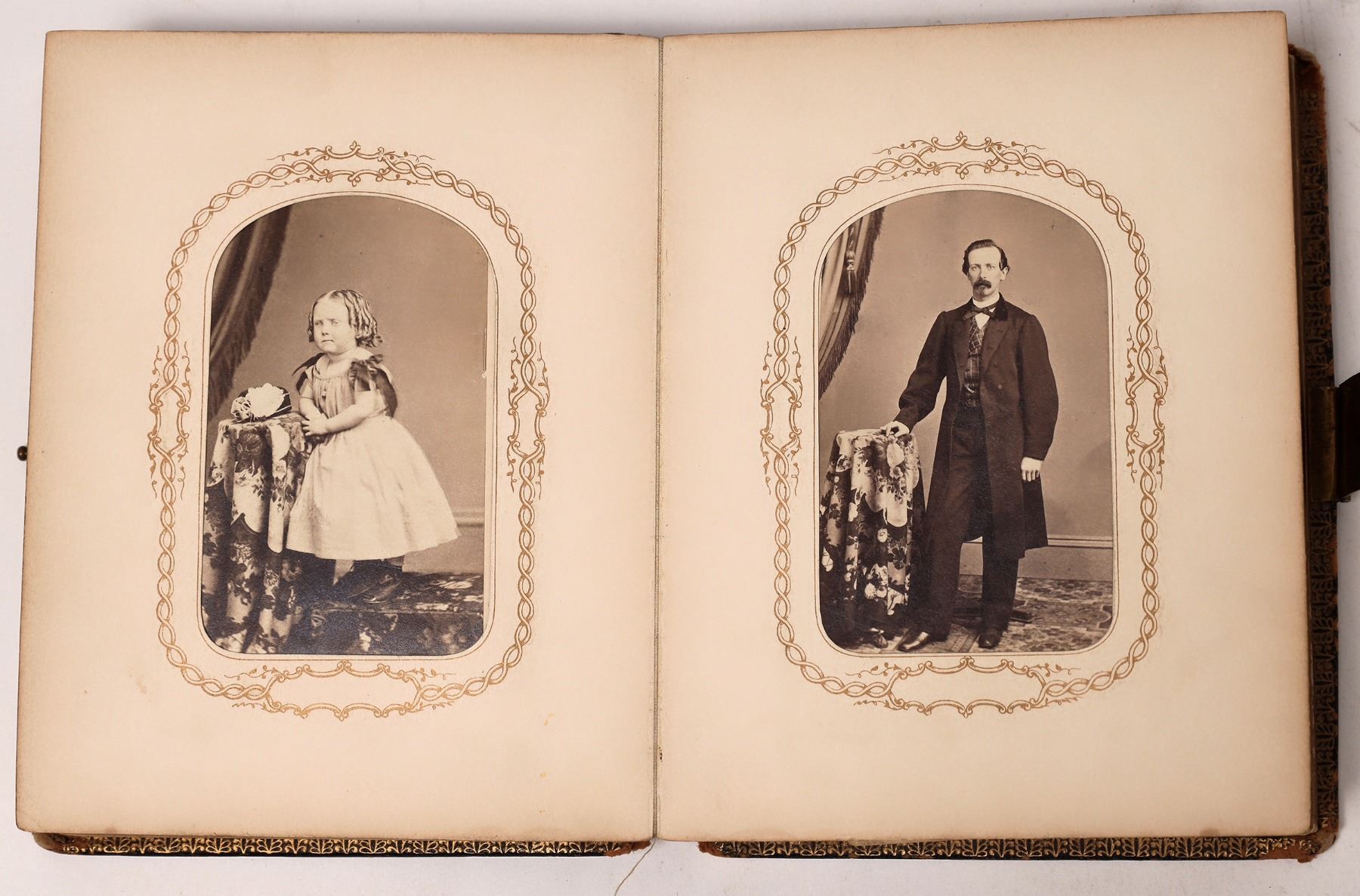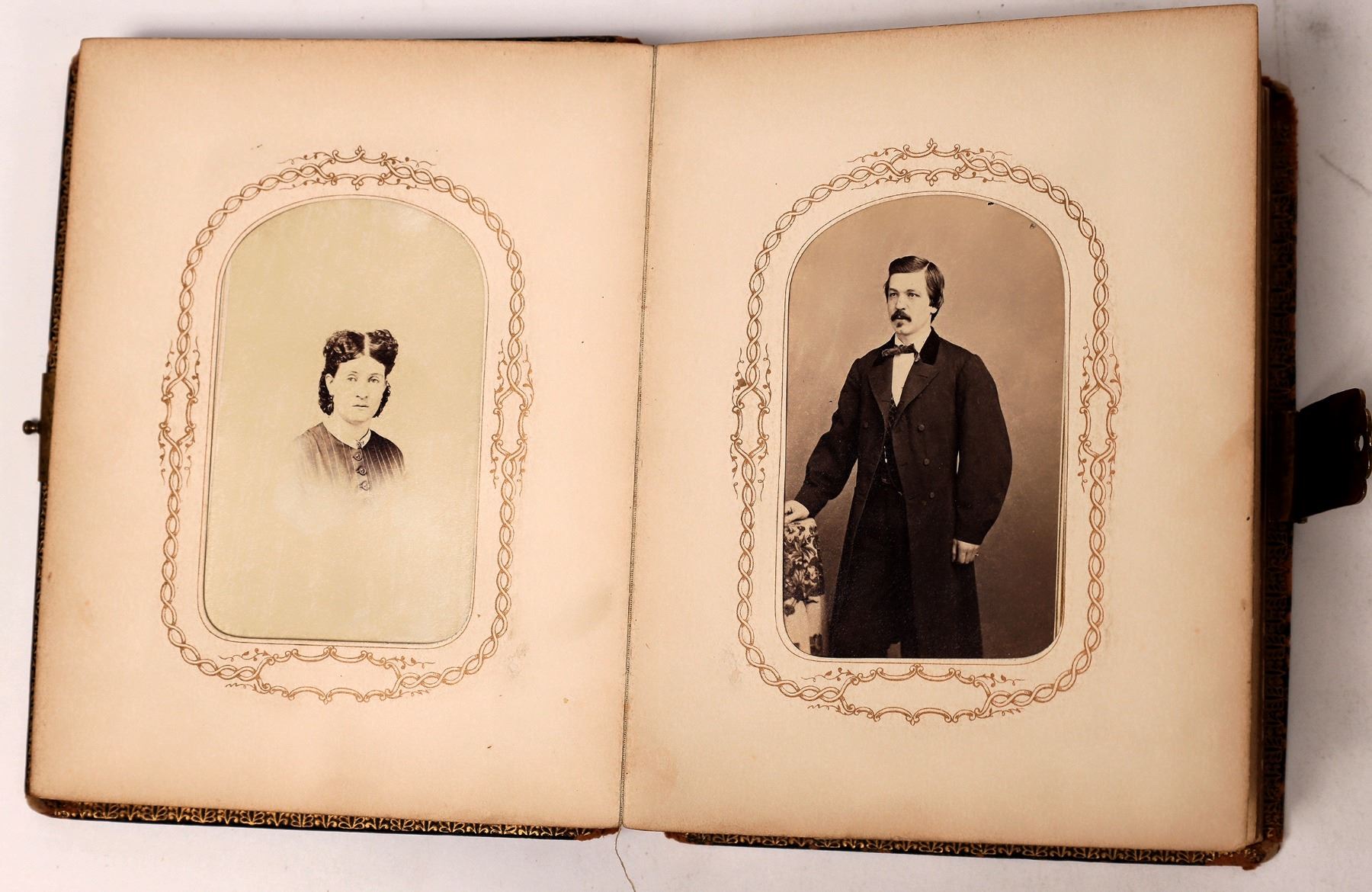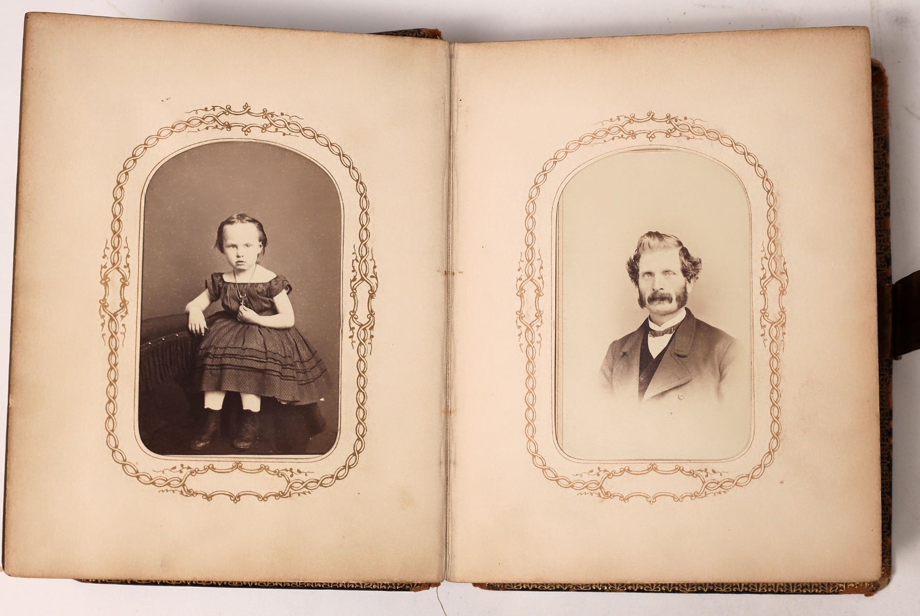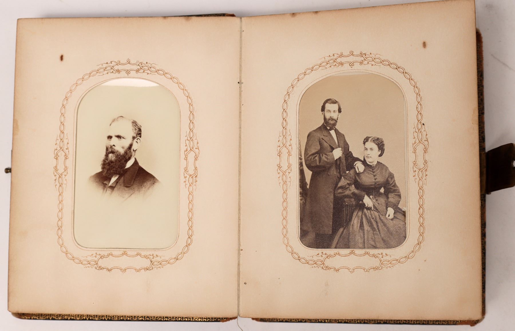 About 35 family portraits including a man in a uniform, possibly a Cadet. Mounted in a 6.25x5" leather album with brass clasp. Nice group with babies to men with beards. San Francisco California
