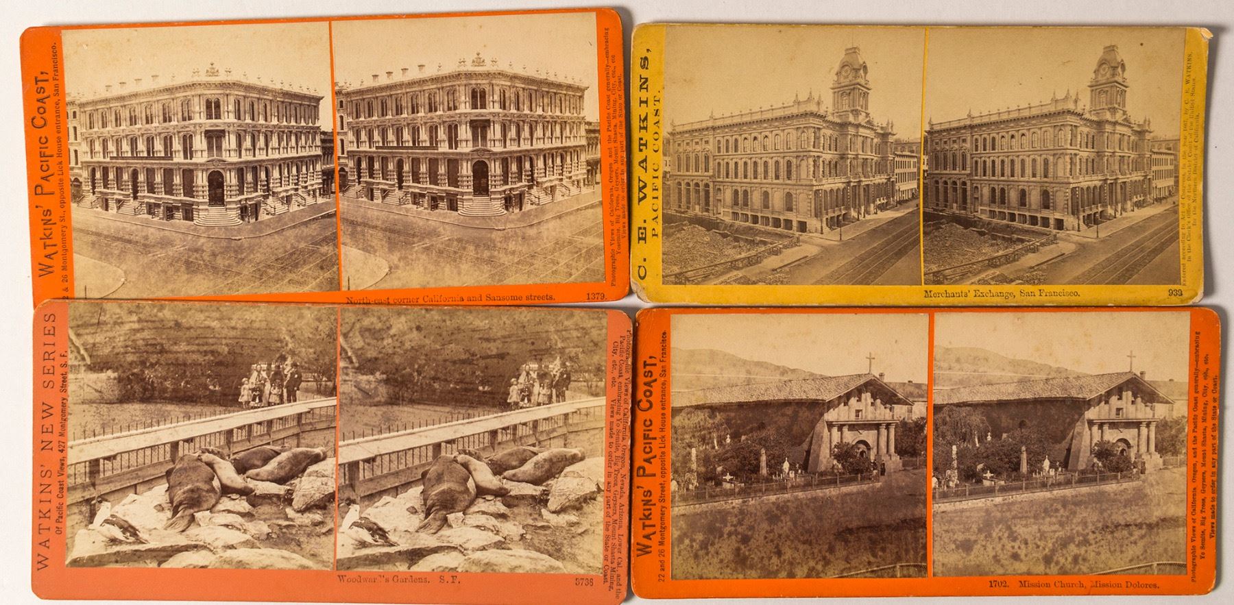 Four different by this famed Western photographer spanning three decades. 1) Earliest is c.1867 card showing the Merchants Exchange. Some soiling and chips to edges. 2) Two c.1874 cards, one showing the North-east corner of California and Sansome streets, the other showing the church at Mission Delores. Wear to both. 3) c.1880s card showing people looking at seals at Woodward's Garden. (Prag Collection) Date: Location: San Francisco, California HWAC # 54785