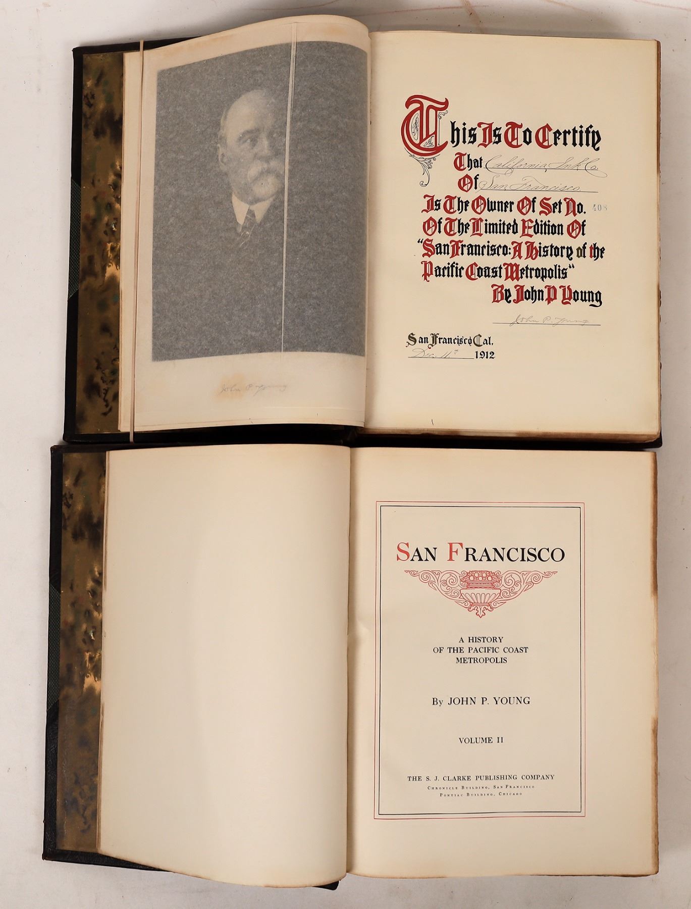 S. J. Clarke Publishing Company, San Francisco, 1912, 969 pages. This is the Limited edition. Original three-quarter black morocco, green pebbled cloth boards Marbled endpapers; gilt top edge. Folded maps intact. Frontispiece portrait of John P. Young. Condition: Very Good. Slight wearing to one corner on Vol 1 and top and bottom of hinges and corners on Vol 2. 1/4" cot on cover of Vol1. Beautiful set. San Francisco California 1912