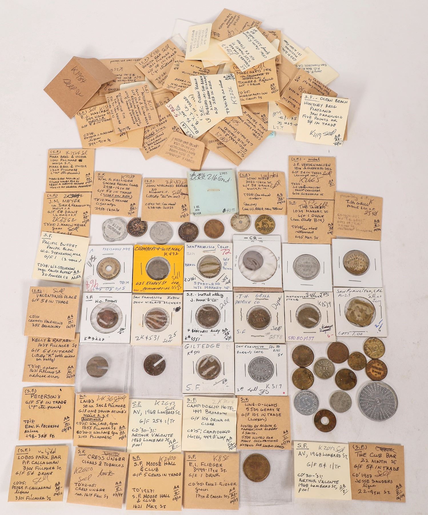 Lot of 97 different San Francisco tokens, mostly from the estate of the well respected token dealer Jerry F. Schimmel. Roberts-At-The-Beach; Magnolia Bar; Martin's Cafe; Bonita Bar; The Manhattan and many more. San Francisco California