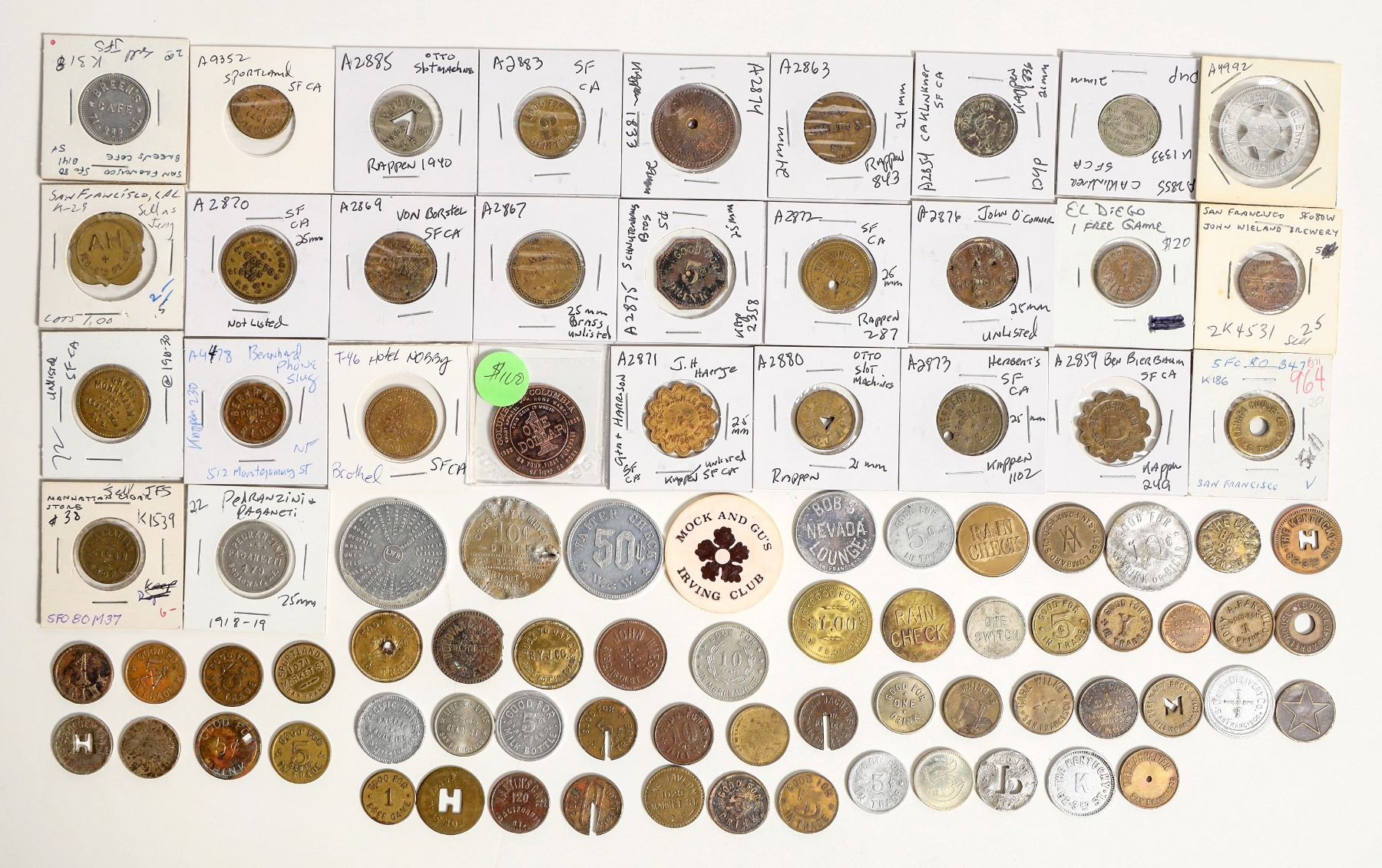 About 80 tokens from San Francisco businesses. All different, many early pieces. Building Trades Temple; Chris Monrmann; Barrel House; Caboara's; Peterson's; Club Bar and many more.