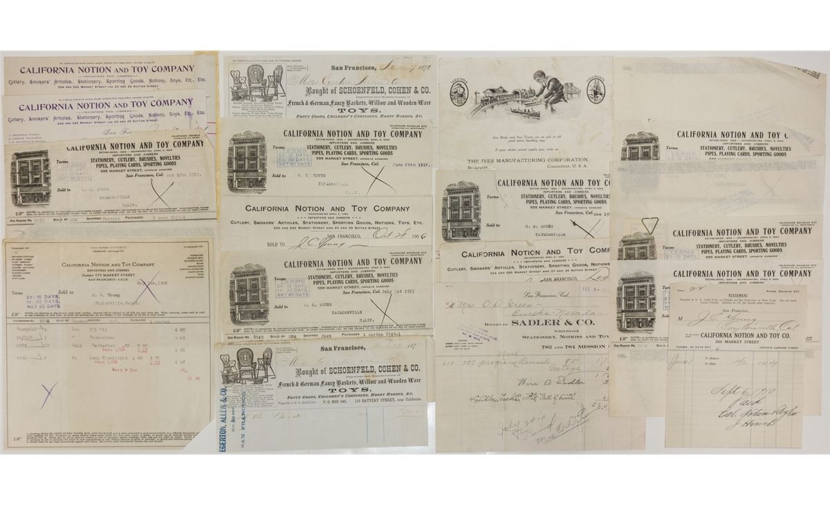 Receipts from various toy and novelty companies: Schoenfeld, Cohen & Co., California Notion and Toy Co., Baer Notion and Toy Co., Sadler & Co., and more.