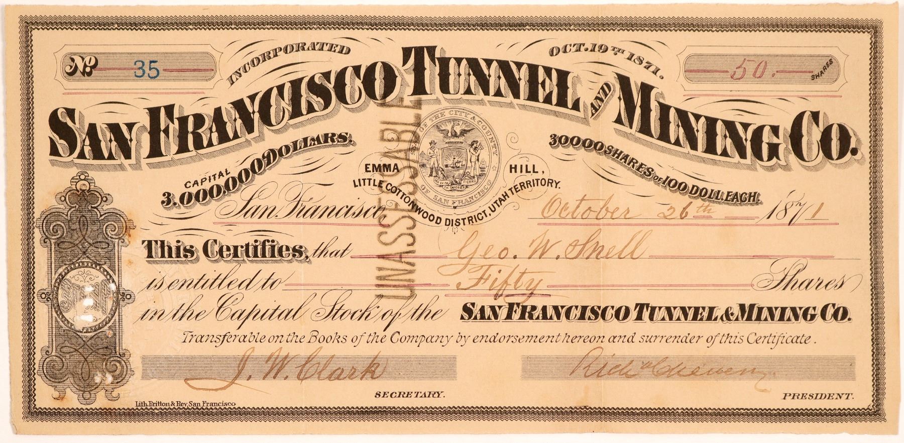 Emma Hill, Little Cottonwood District, Utah Territory (printed under title). Inc. Oct. 19th, 1871. No. 35, issued for 50 shares to Geo. W. Snell on October 26th, 1871 in San Francisco. Signed by president Rich Clemens and secretary JW Clark. Not cancelled. Black border and print, California State seal vignette. Printed by Britton & Rey, SF. Heavy folds and toning, holes in corporate seal. 4 x 9" Not in Filer or Holabird indexes. No additional information located at this time. Ken Prag Collection