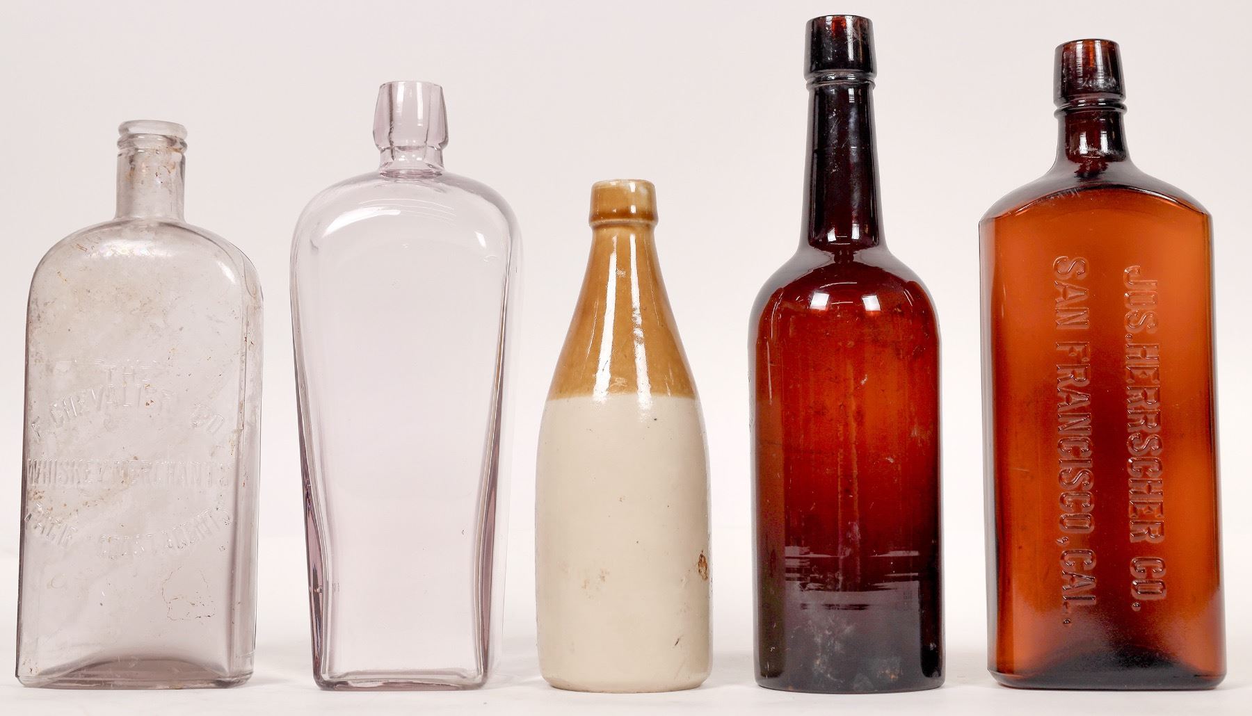2 scarce San francisco Whiskey fifths. Clear crown top The/F. Chevalier Co/Whiskey Merchants/Pacific Coast Agents-stained. Amber Jos. Herrschner Co./San Francisco, Cal. 8.5" 2 tone ceramic. 10" clear rectangle whiskey. Amber unmarked fifth. No apparent chips or cracks. San Francisco California Fred Holabird Collection