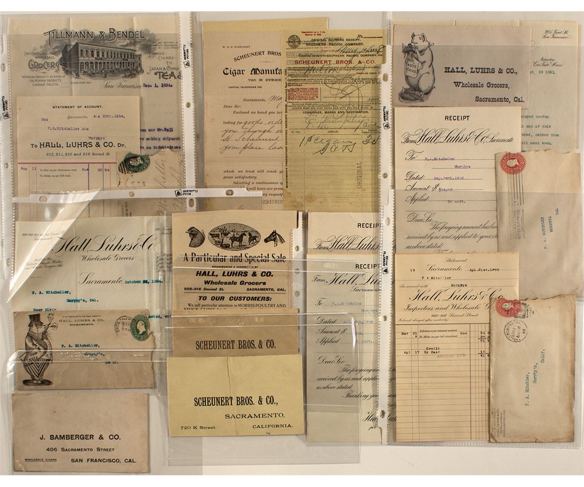 13 pieces. ONE handbill. Three 1894 Hall, Luhrs & Co. All with pictorial covers. Two different vignettes. Four Hall, Luhrs & Co. 1899 and 1902. 1894 Tillman & Bendel. 1898 Scheunert with unused return envelope and Southern Pacific shipping receipt. Unused J. Bamberger & Co. 2 unused Scheunert Bros. & Co. return envelopes.City: County: State: CADate:
