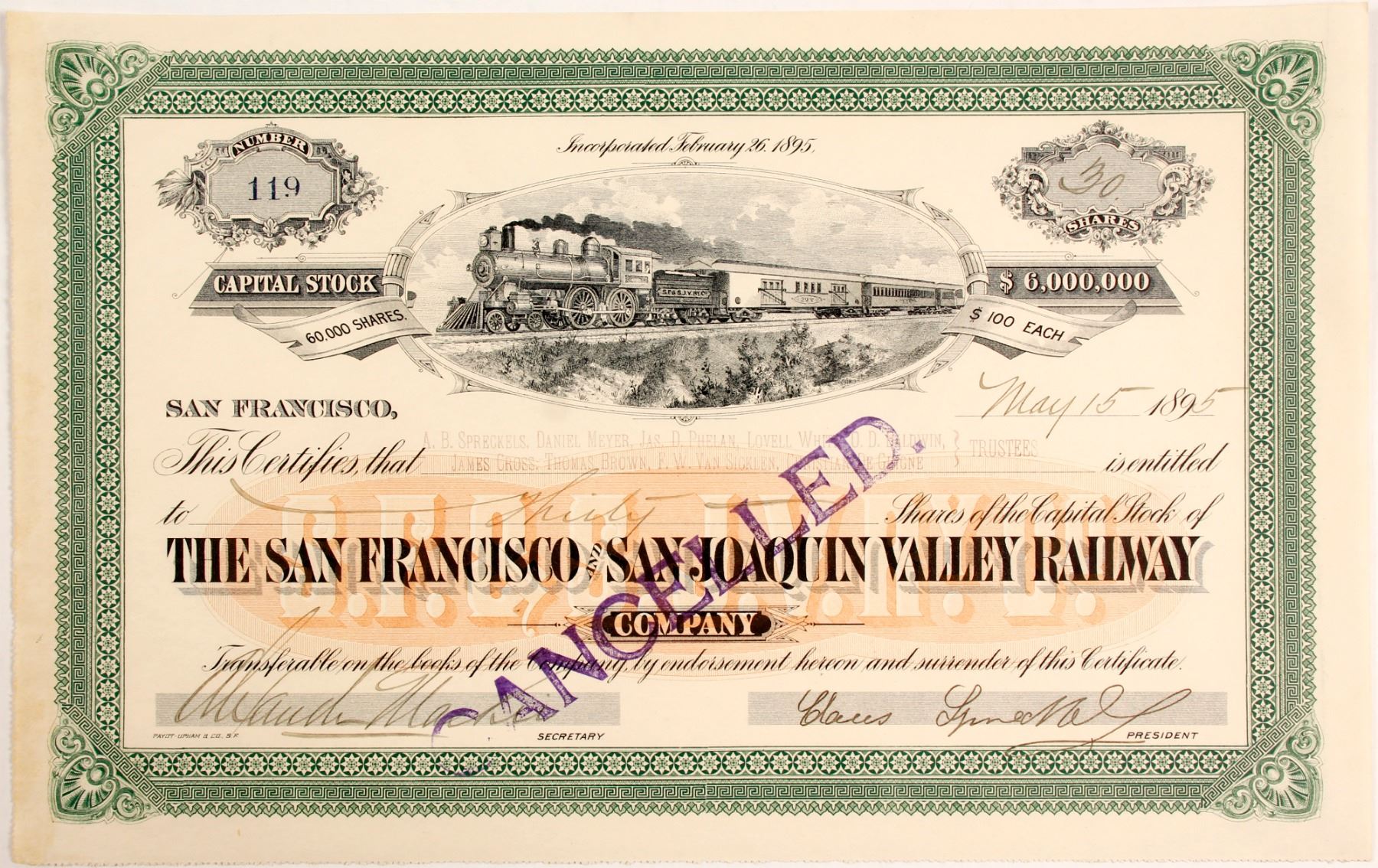I/C #119 30 shares 1895 signed by President illegible. Nice train vignette. "In the shadow of soured relations with Spain, the second railroad to operate in Kern County was being constructed from San Francisco through Stockton and south into Bakersfield, right into what is currently the BNSF rail yard. The San Francisco and San Joaquin Valley Railroad was known by informal names including the "People's Railroad," and more commonly, the "Valley Road." The idea for building a second railroad down into the San Joaquin Valley grew from frustration with the monopoly the Southern Pacific Railroad held over valley industry and agriculture." from Bakersfield.com. No creases. Prag Collection State: City: Date: 1895 HWAC# 84170