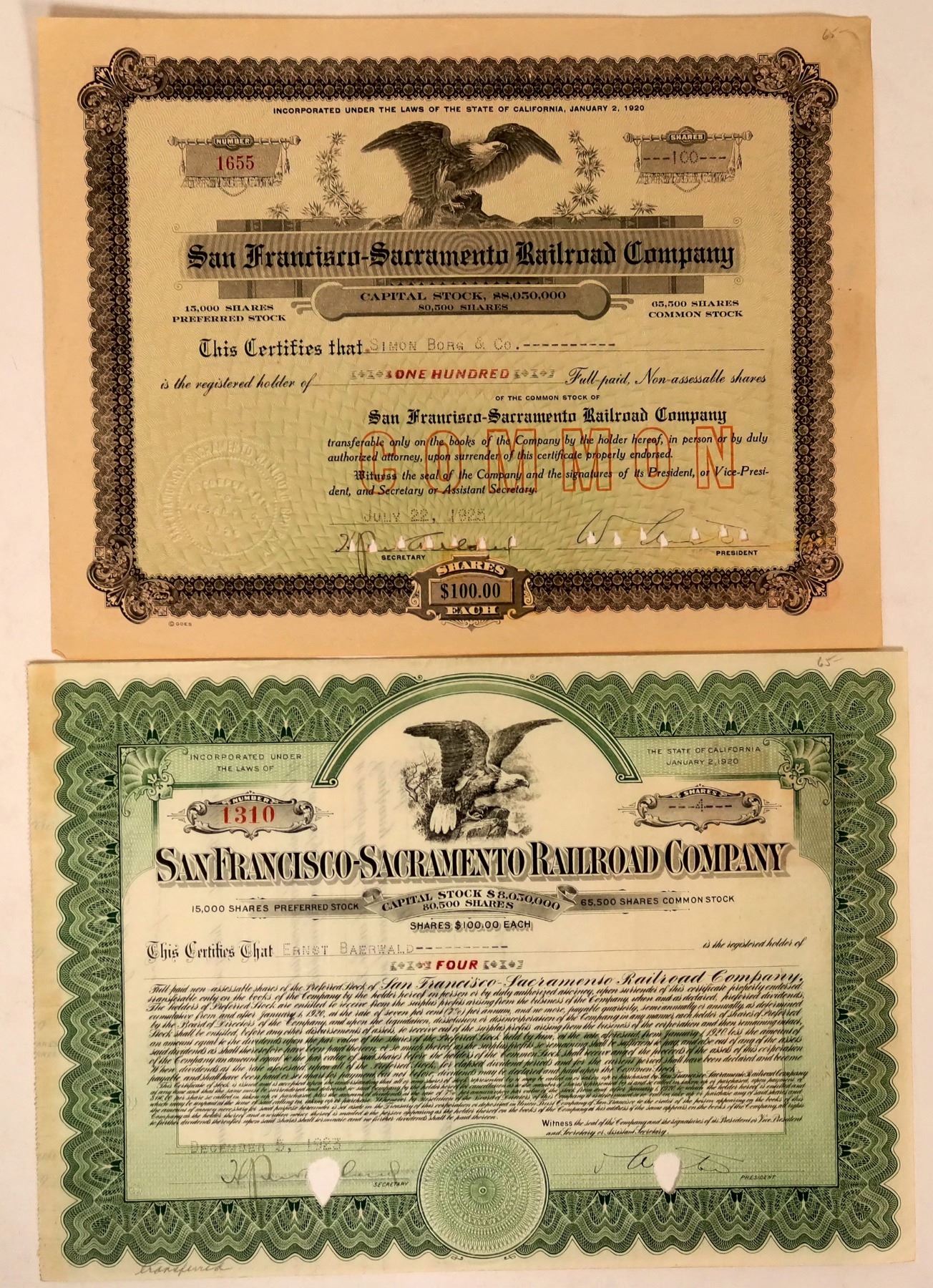 2 certificates. Chartered 1920. The Oakland, Antioch, and Eastern Railway was a trolley-wire powered line that ran from Oakland through a tunnel in the Oakland hills to Moraga, Walnut Creek, Concord, Pittsburg, to Sacramento. It was renamed the San Francisco-Sacramento Railroad briefly. 1. #1310, I/C, 4 shares $100 par issued Dec 5, 1923. Green, embossed seal, vignette eagle wings spread, 4 revenue stamps on reverse. PREFERRED green underprint. Unknown printer. EF 2. #1655, I/C, 100 shares @ $100 ea. issued July 22, 1925. Black, embossed seal, vignette eagle wings spread, green underprint, Goes printer. EF